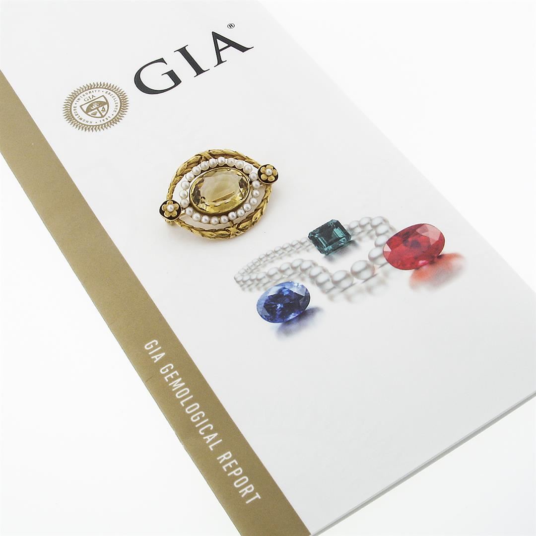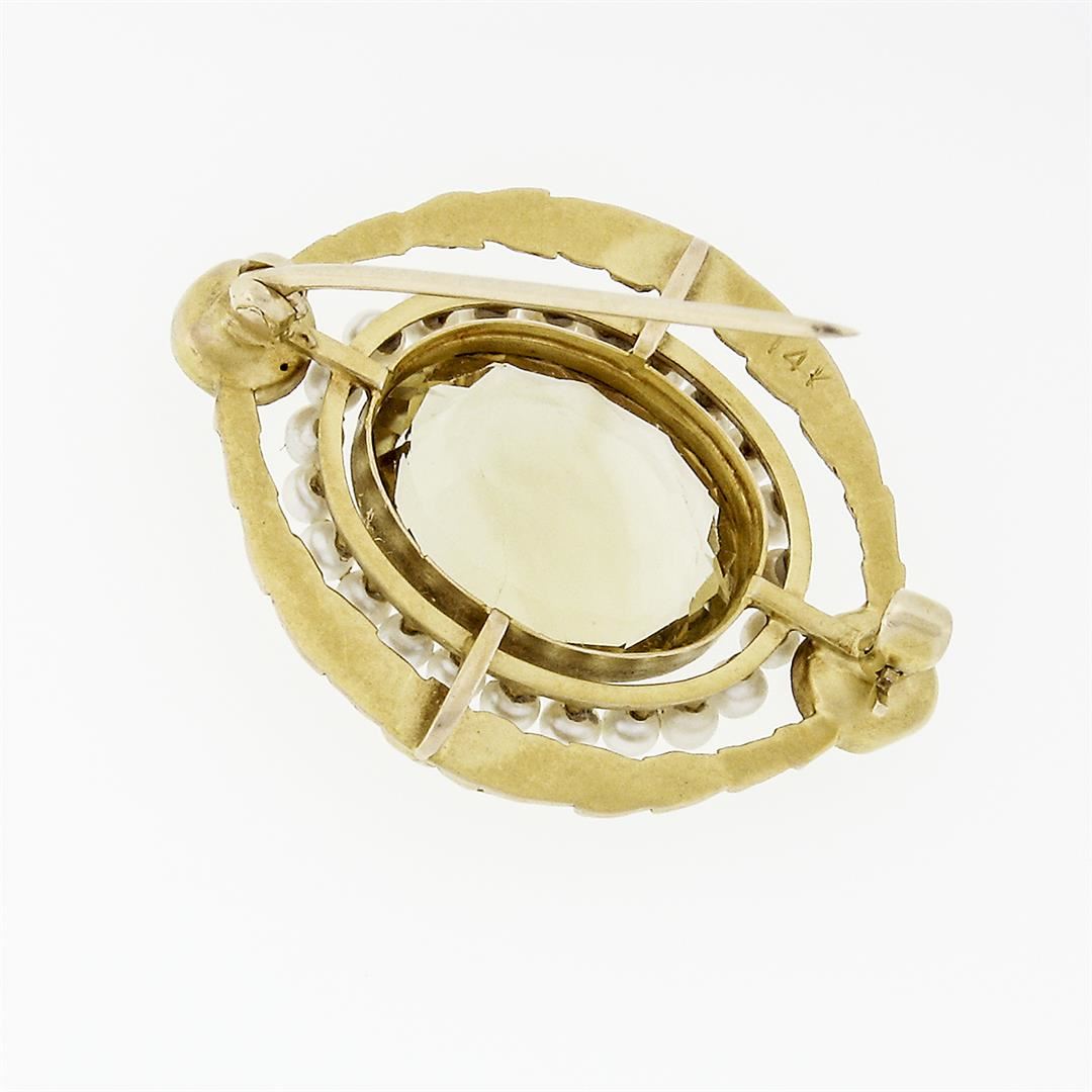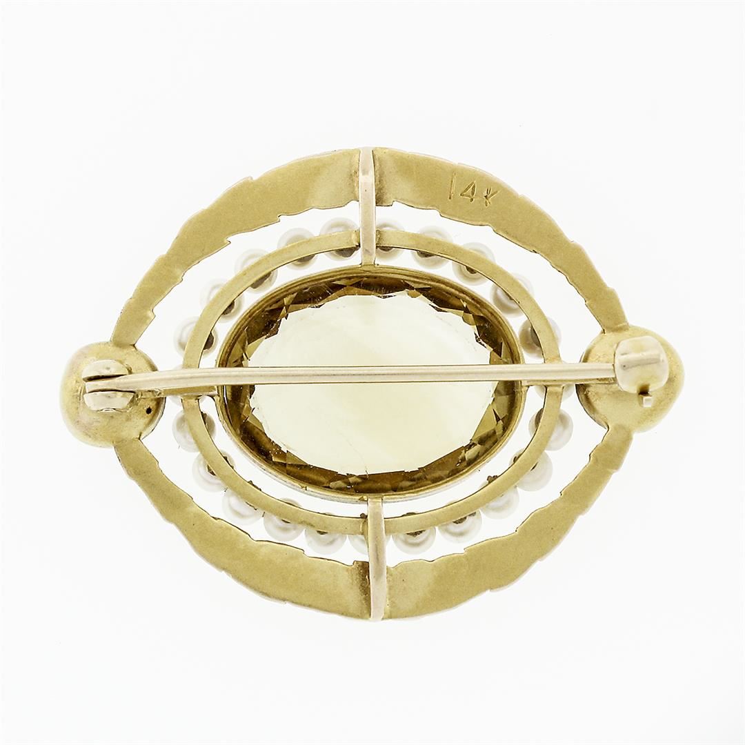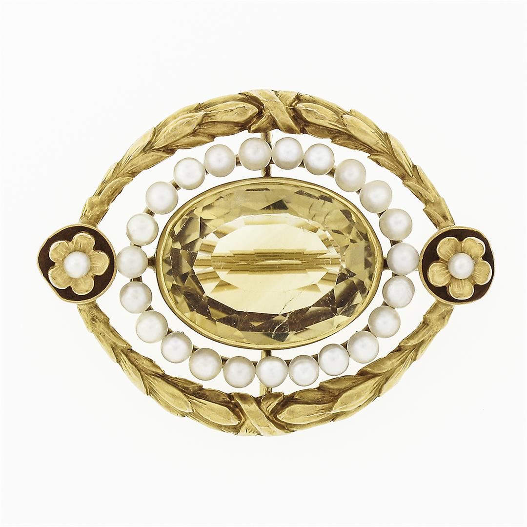 An antique solid 14k yellow gold pin brooch, wirh 1 Gia certified oval step cut natural citrine (5.93ct ), and 25 natural cultured pearls (2.0mm to 2.5mm). Measures 25.7x33.8mm and weighs a total of 6.72 grams. Comes with all original relevant certifications.