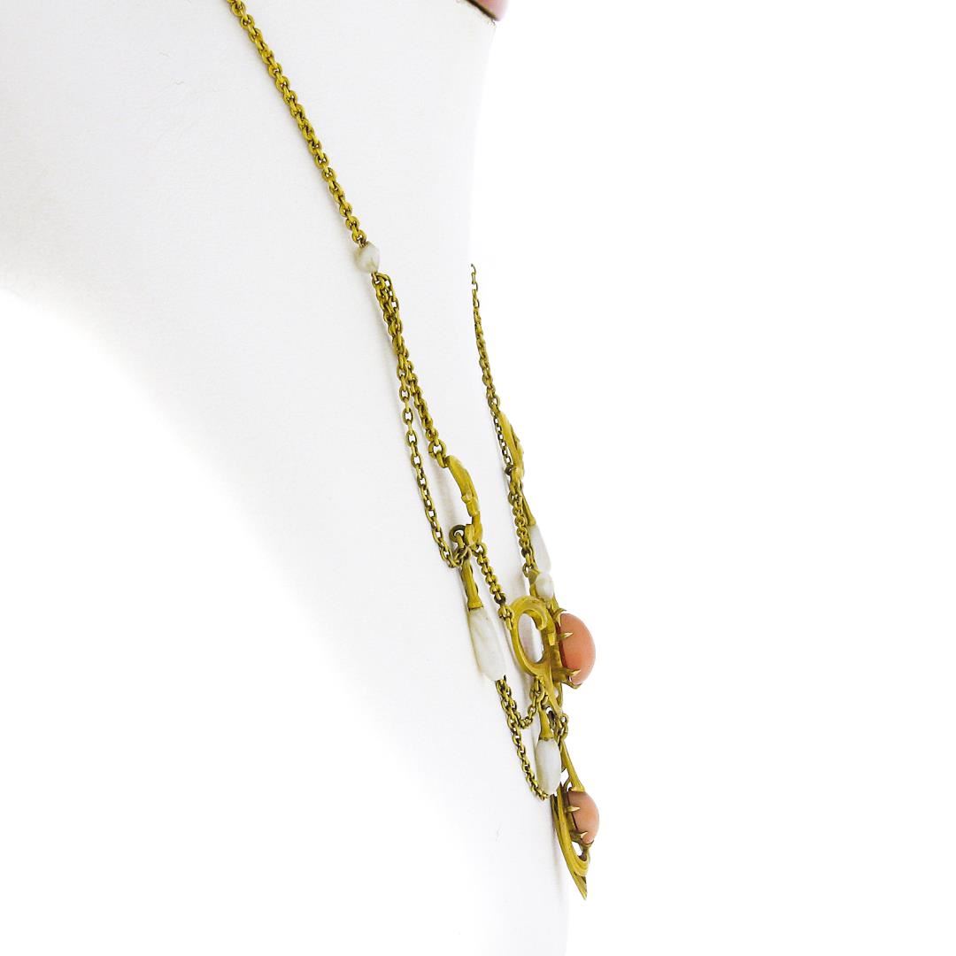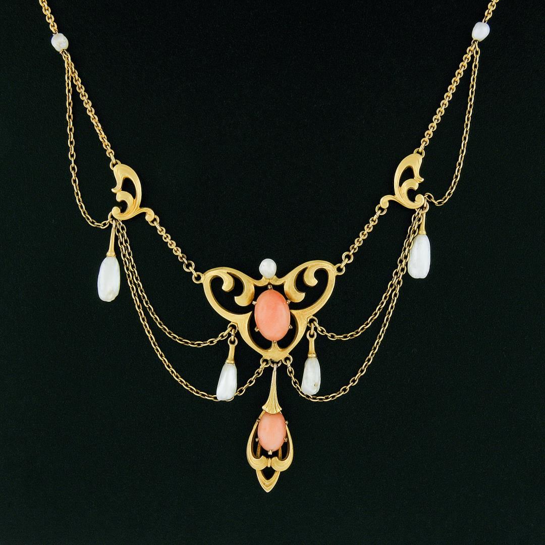 An antique 14k yellow gold swag necklace by krementz, with 2 oval cabochon cut natural corals (10x6.9mm and 8x5.5mm), and 7 baroque shape cultured freshwater pearls (9.1x4.4mm to 3.4x3.2mm each). It weighs a total of 11.56 grams, measures 5.5 inches wide, and measures 20.5 inches in length.