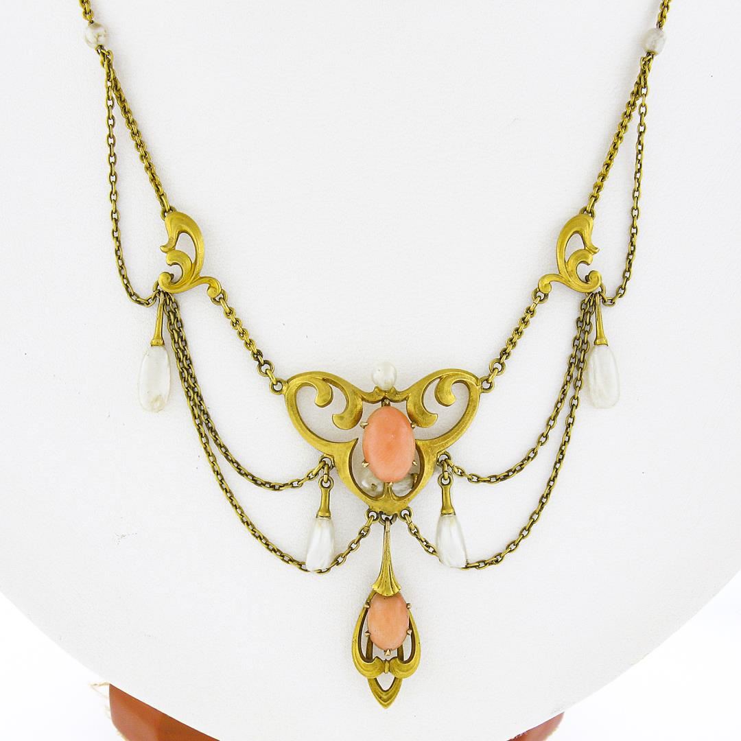 Antique Art Nouveau Krementz 14K Gold Coral & Freshwater Pearl Swag Necklace
