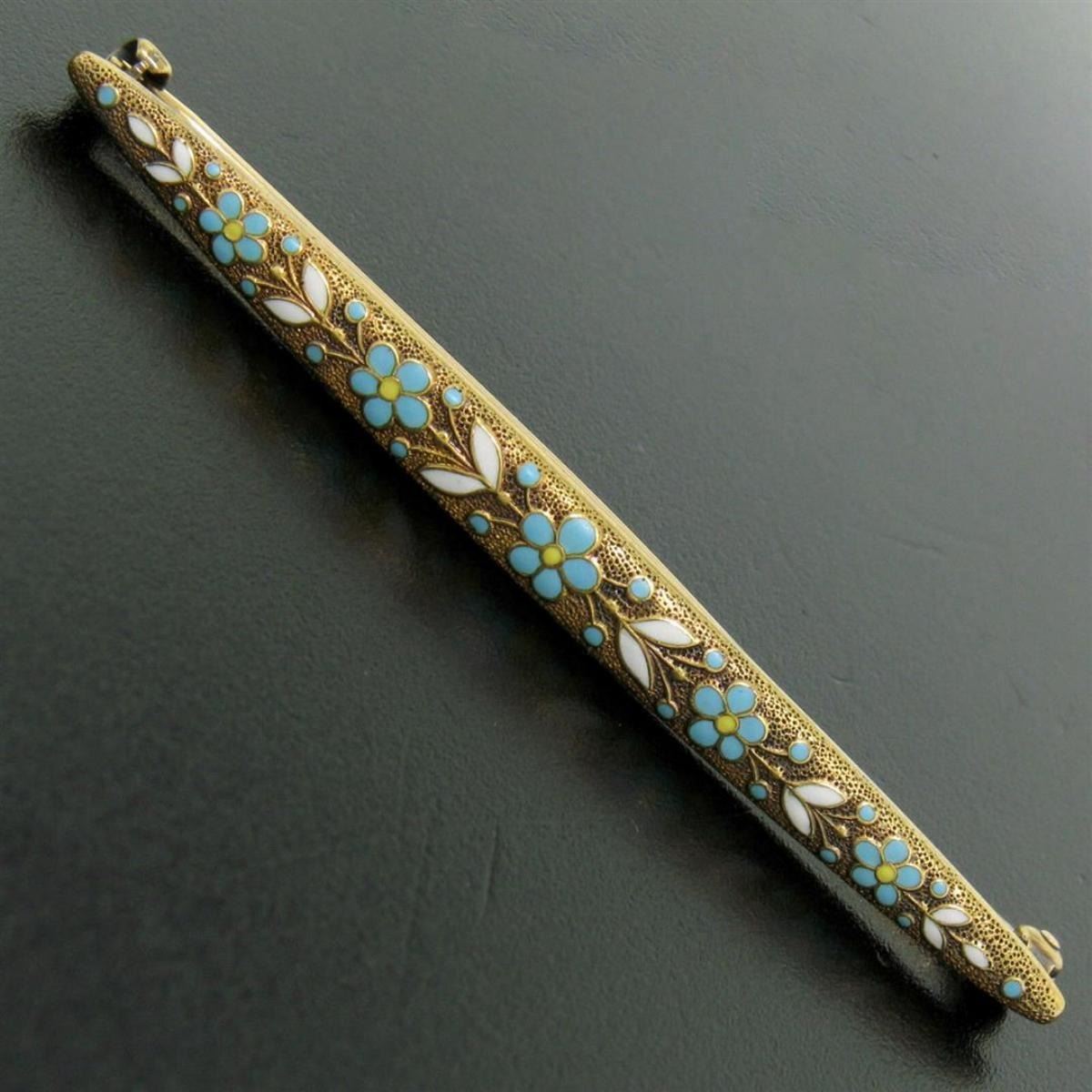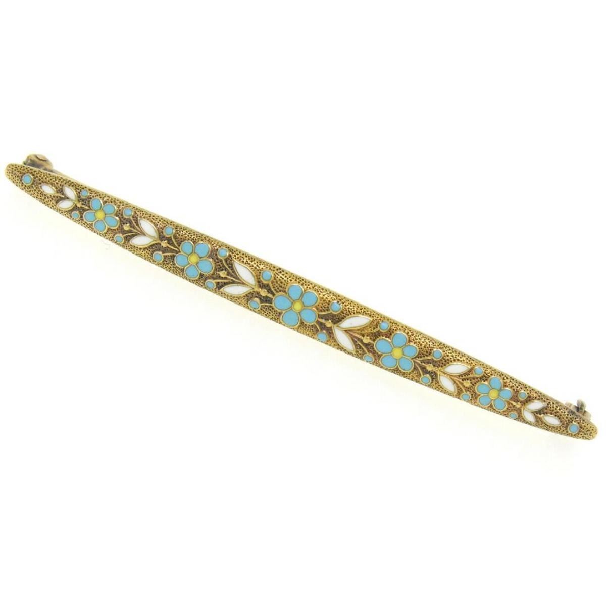 One Antique Art Nouveau Krementz 14K Yellow Gold White and Turquoise Enamel Daisy Flower Bar Pin Brooch. Item Details: Material: 14K Solid Yellow Gold, Total Weight: 3.80 Grams, Overall Length: 63.10mm, Overall Width: 5.15mm, Overall Thickness: 3.2mm (not including the pin), Clasp: Pin Backing w/ Rotating Lock Mechanism, Hallmark(s): 14K *Krementz Logo*, Condition: Antique art nouveau period piece by Krementz. Original patina has been preserved. Outstanding condition!