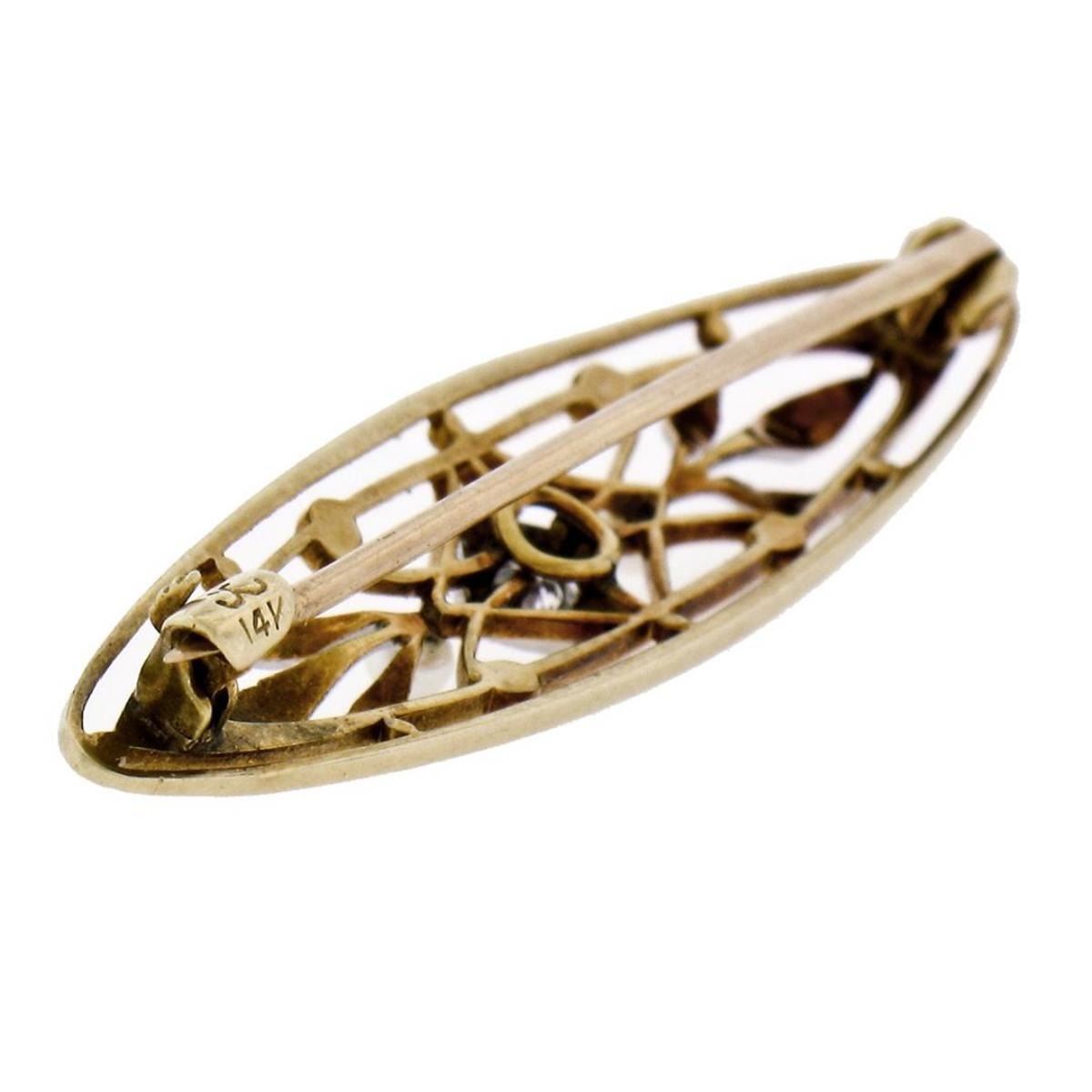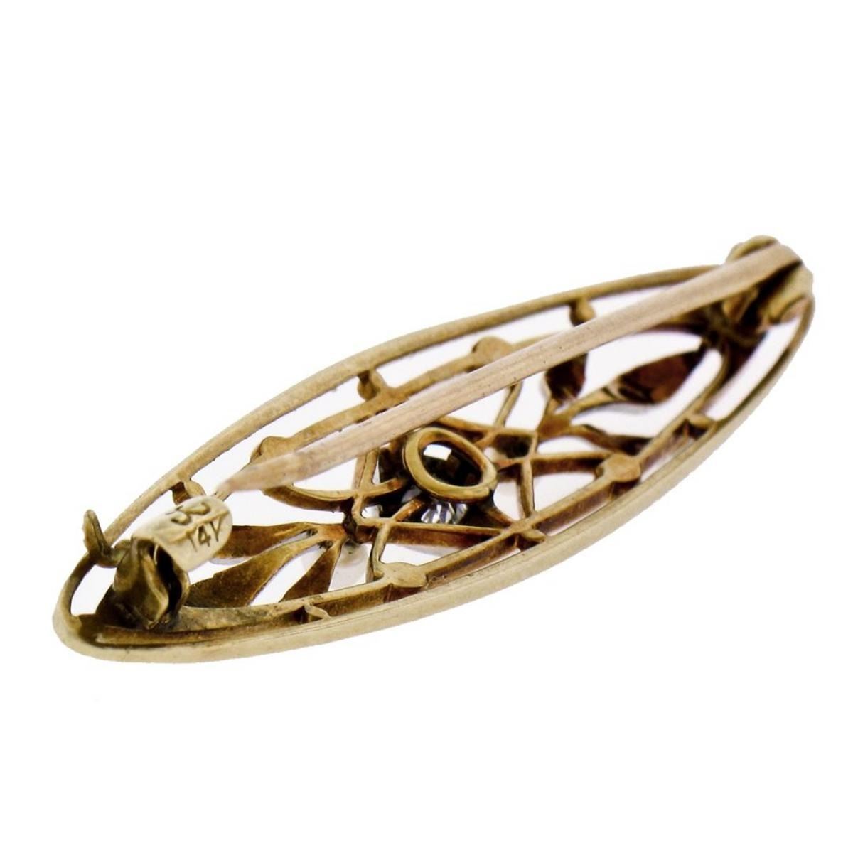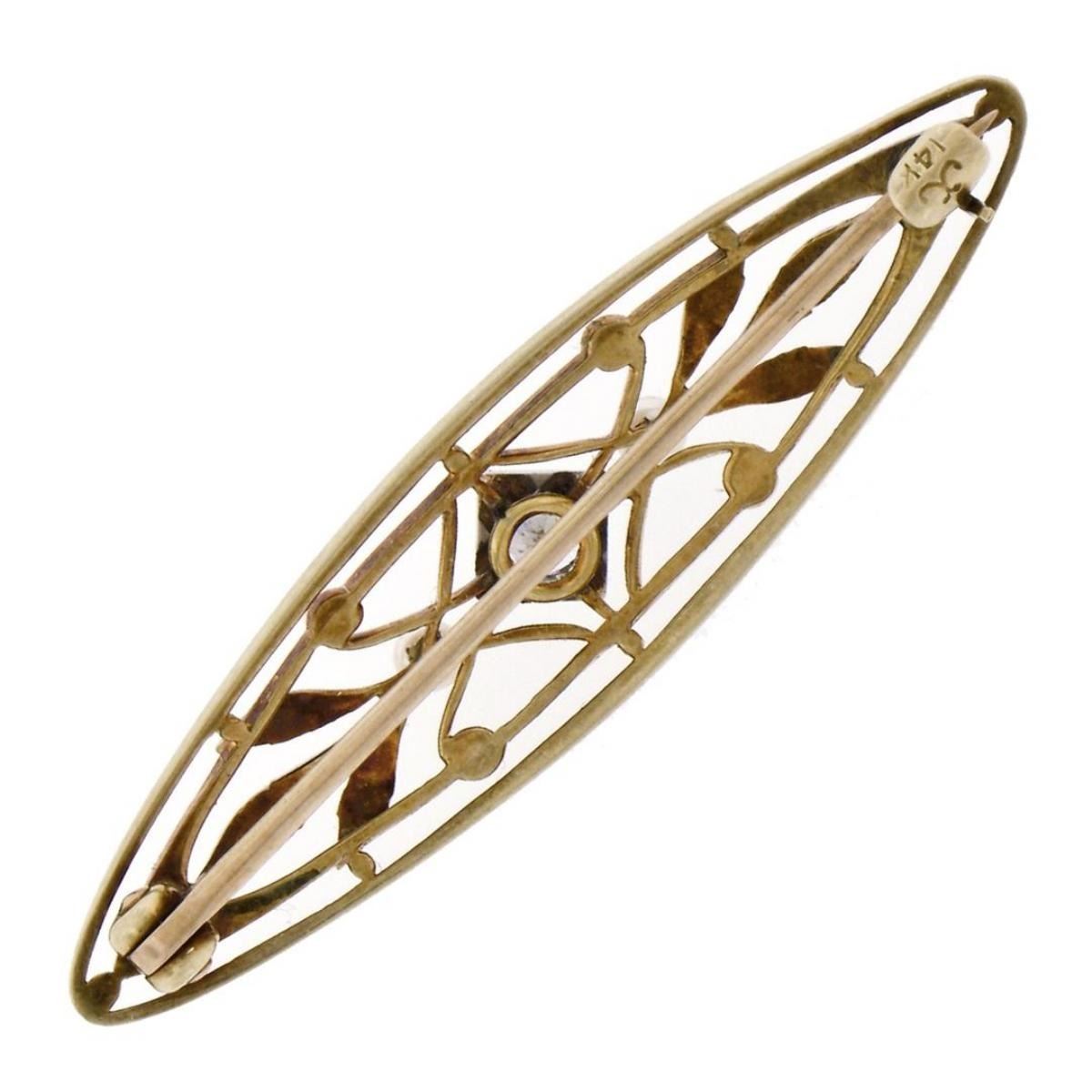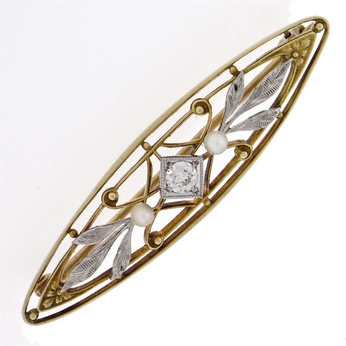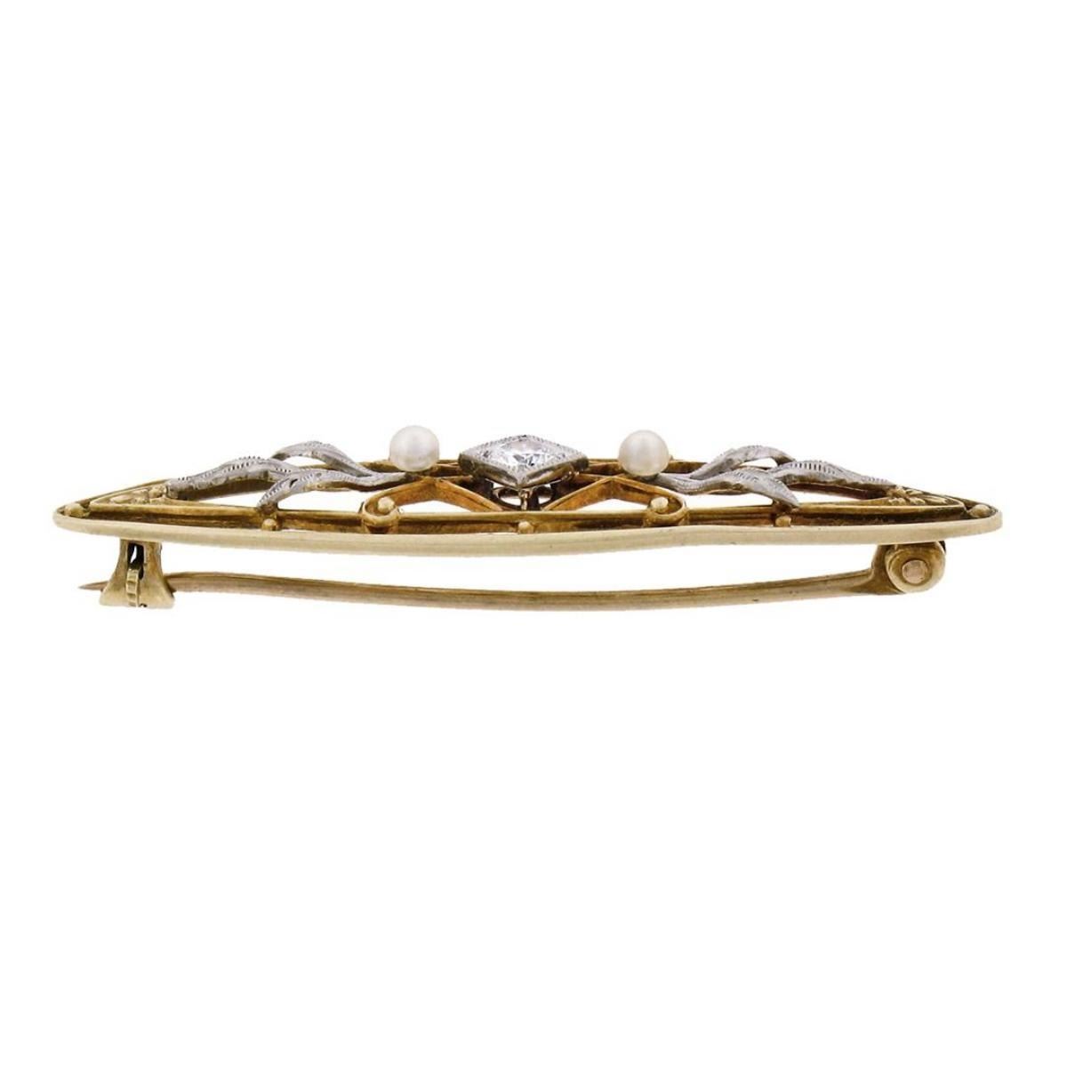 An art nouveau period solid 14k yellow and white gold bar pin / brooch made by Krementz. It features and old European cut diamond (F - VS2; 0.10ct) at its center flanked by a round cultured pearl (2.25mm) on each side. Measures 10.00x39.45mm and weighs a total of 2.50 grams.