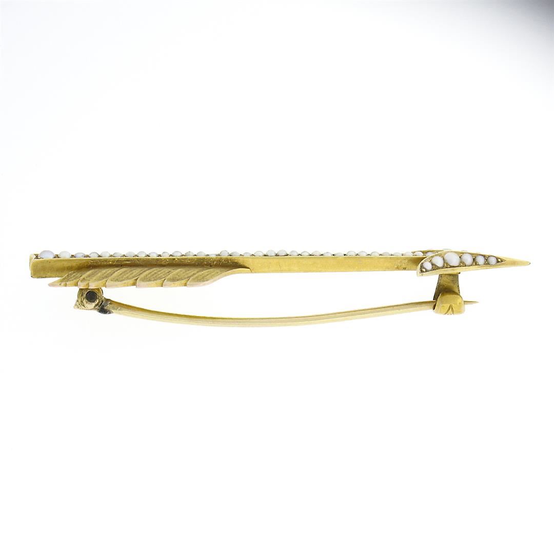 An antique solid 14k yellow gold arrow pin brooch, with 45 round shape cultured seed pearls (1.0mm to 1.8 mm). Measures 51.0x9.50mm and weighs a total of 3.76 grams.