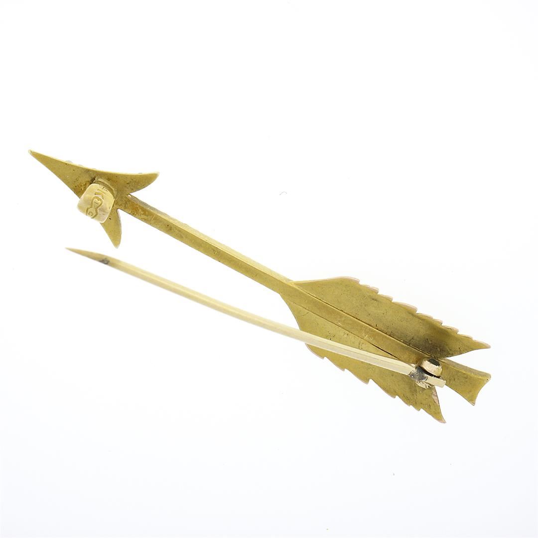 An antique solid 14k yellow gold arrow pin brooch, with 45 round shape cultured seed pearls (1.0mm to 1.8 mm). Measures 51.0x9.50mm and weighs a total of 3.76 grams.