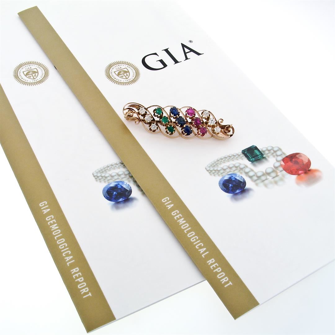 An antique solid 14k rose gold leaf pin brooch, with 3 Gia certified cushion cut natural sapphires (1.20ctw ), and 3 Gia certified cushion cut natural rubies (1.05ctw ),3 cushion cut natural emeralds (0.50ctw ), and 6 old mine cut natural diamonds (G to I - VS2 to SI2 ; 0.85ctw ). Measures 57.30x16.51mm and weighs a total of 12.00 grams. Comes with all original relevant certifications.