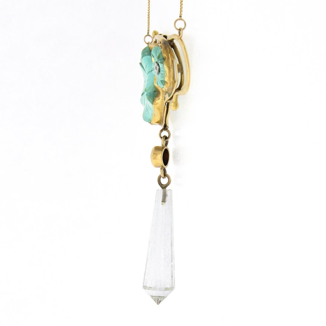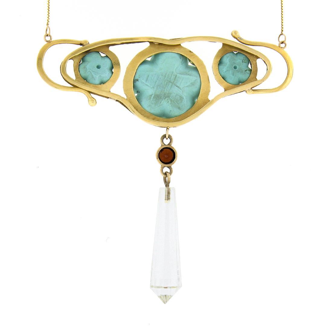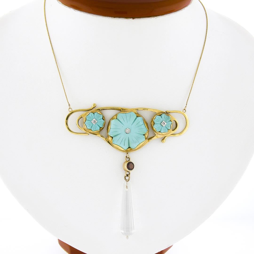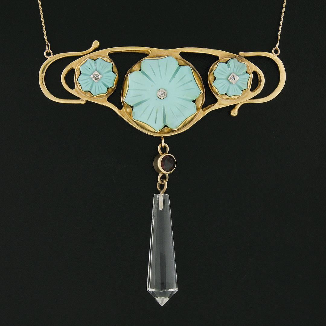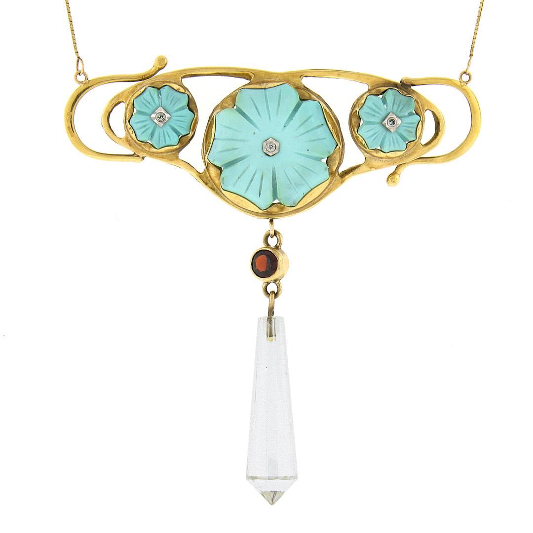 An antique solid 18k yellow gold dangle necklace, with 3 carved flower shape natural turquoises (20.5x19.6mm to 10x10.3mm each ), and 3 old single cut natural diamonds ( G/H - SI2 ; 0.05ctw), with 1 old round cut natural garnet (4.6mm), and 1 faceted drop shape natural rock crystal (30x8.3mm). 15.5 inch box link chain, 13.74 grams total weight, pendant measures 69.50x66.90mm.