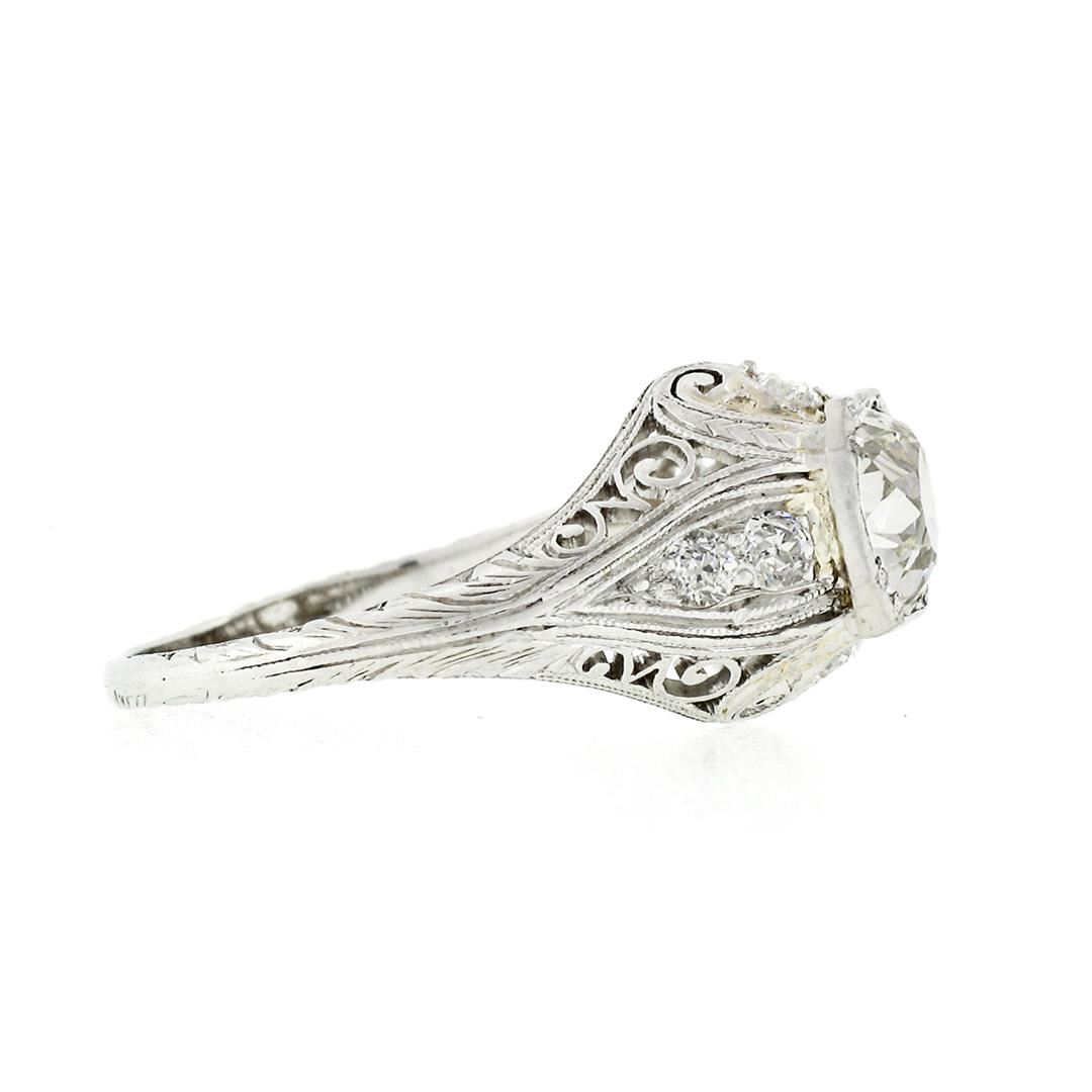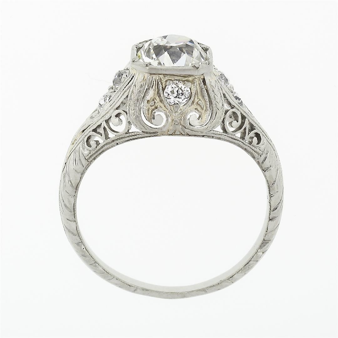 An antique solid platinum engagement ringm with 1 old european cut natural diamond (I- VS2; 1.0ct ), and 6 old mine & european cut natural diamonds (G/H- VS1/VS2 ; 0.32ctw). The ring is size 5.5, weighs a total of 3.71 grams, and measures 10.2mm wide.