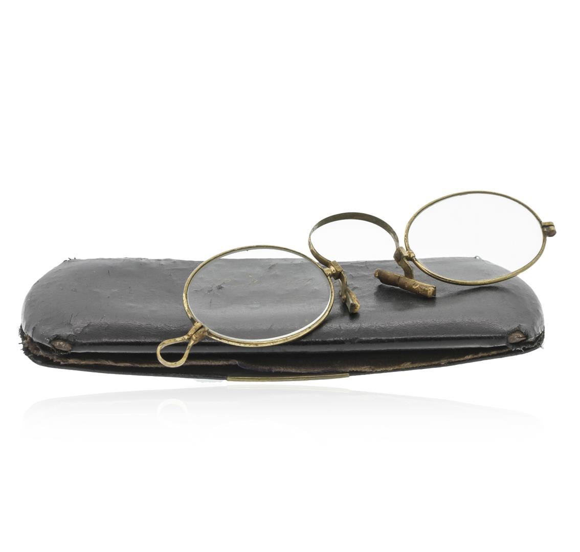 Antique Brass Pince-nez Eyeglasses Circa 1870. Very Well Preserved Condition! This pair of old spectacles with original box is made in the 1870s-18900s, Boston. The frame is made of brass metal. The pince-nez have a very elegant design with elongated oval glasses. The glasses are medical with enlarging effect. The cork nose softener is worn, there is some patina layering. There are very few scratches. The pince nez is in overall very well preserved to excellent condition! A gorgeous antique pince-nez for collections, display and period reenactments! Comes in ORIGINAL Houghton and Dutton Boston Case! Length: 4 inches, stretchable.