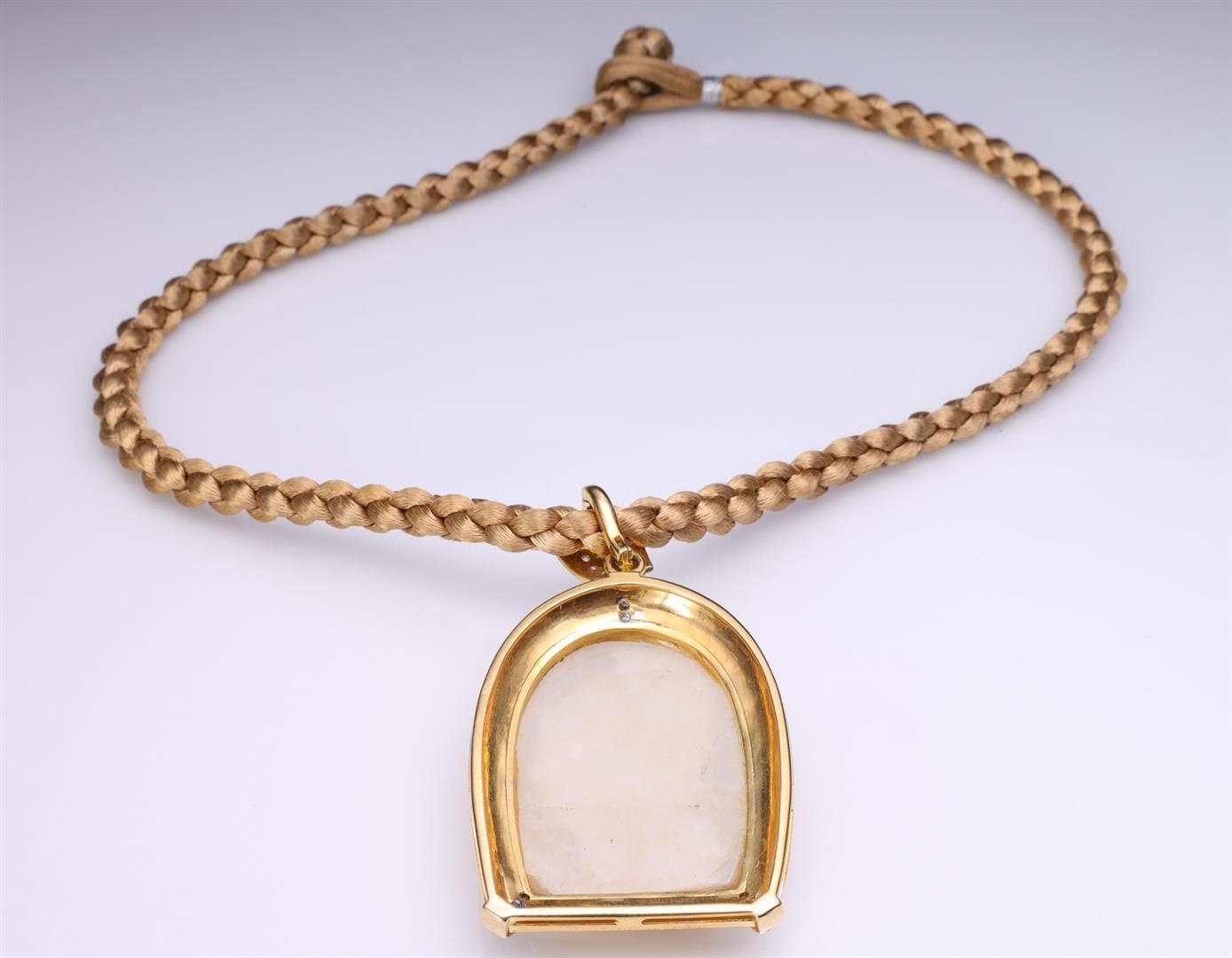 Antique Carved Cameo Agate in Later 18K Yellow Gold and Diamond Mount on Silk Cord containing twenty-four round brilliant cut diamonds weighing approximately 0.50 cts. Total weight of 42.3 gm. Estimated retail value $4,200.