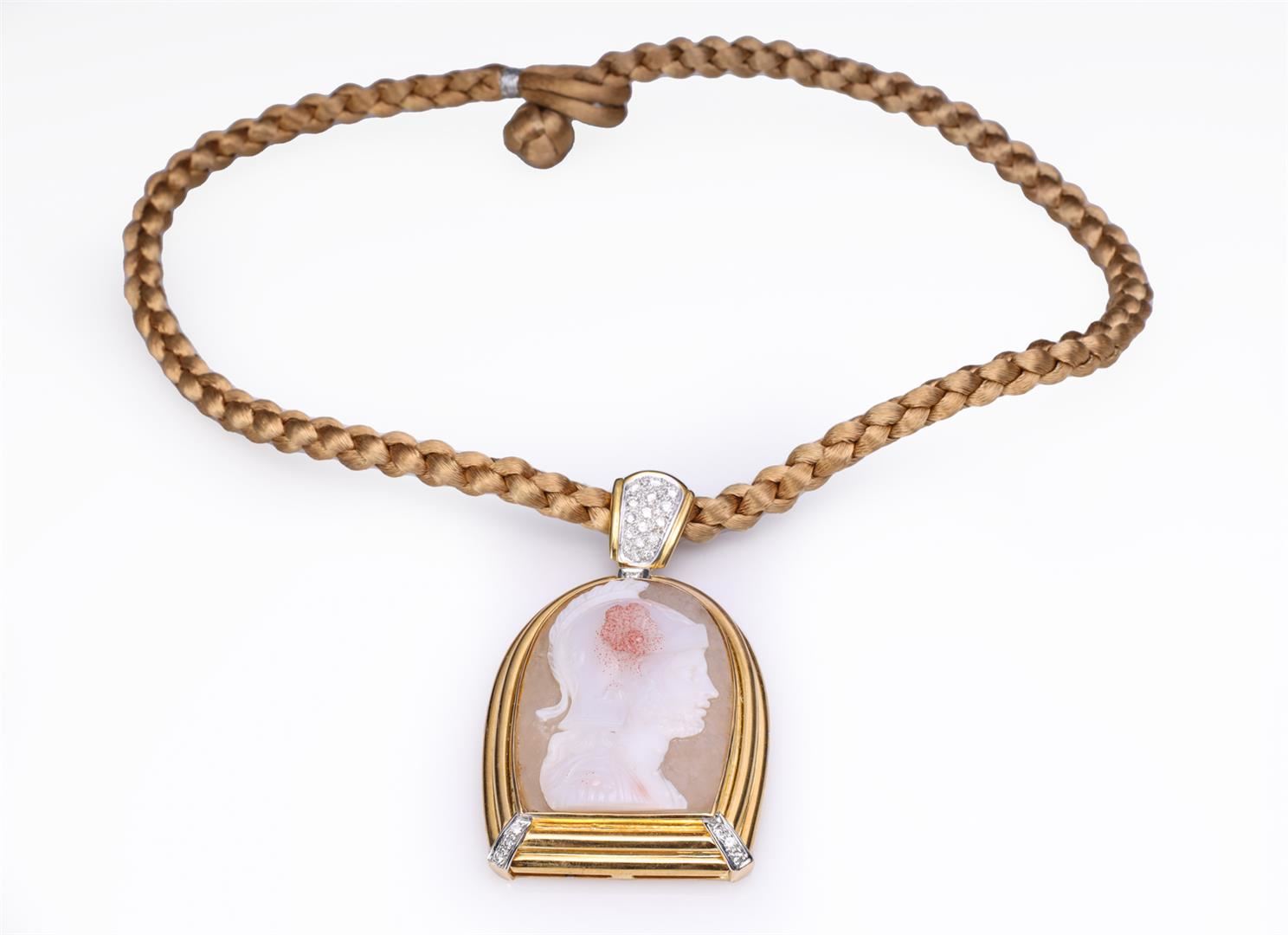 Antique Carved Cameo Agate in Later 18K Yellow Gold and Diamond Mount on Silk Cord containing twenty-four round brilliant cut diamonds weighing approximately 0.50 cts. Total weight of 42.3 gm. Estimated retail value $4,200.