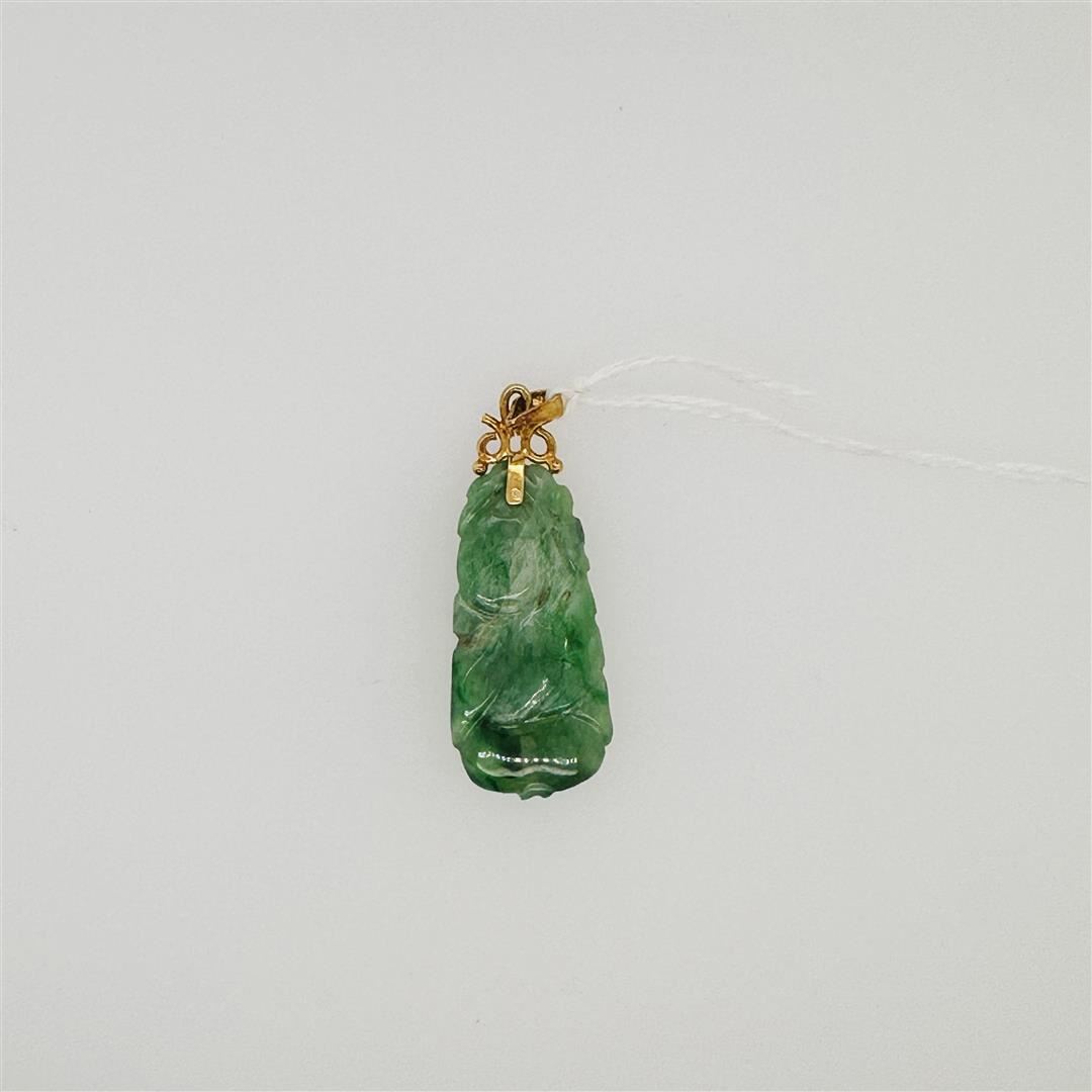 Antique Chinese carved green jadeite pendant later mounted as a pendant in 14k yellow gold, the bail marked 585; gross weight 4.2g, L 1 3/4 inches (approx.)