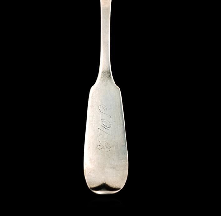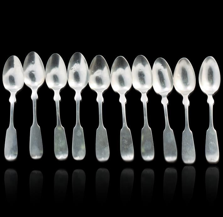 Set of (10) silver spoons crafted by William Wallace Willard of Cazenovia, New York. There is a beautiful period script monogram on the front handle "SWR". It dates from circa 1850 and is in very good condition with typical slight surface scratches and a s amll dings in bowls and on the handles. These pieces measure 6" long.
