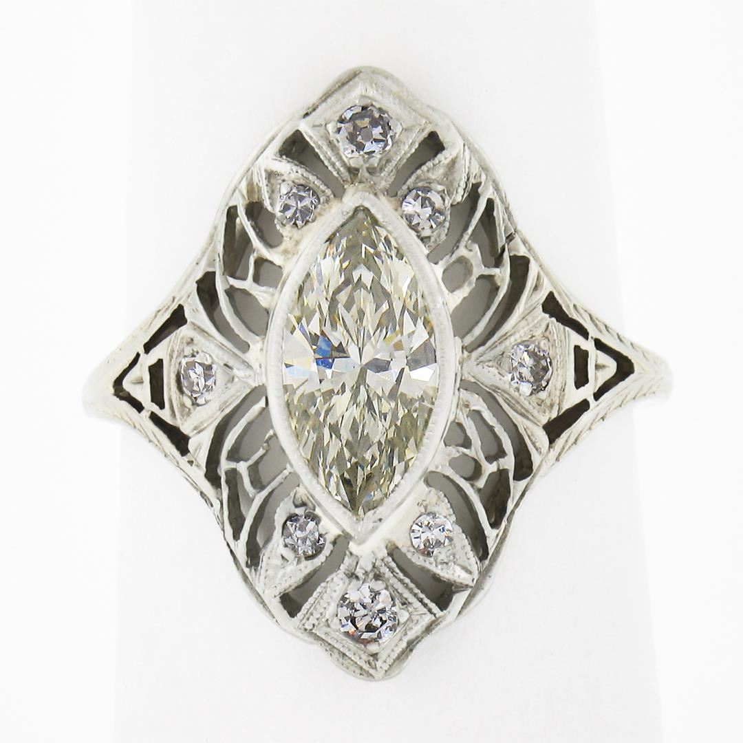 An antique solid 18k white gold ring, with 1 GIA graded marquise cut natural diamond (U- V - SI1 ; 0.94ct), and 8 old single cut natural diamonds (H/I - VS2-SI2 ; 0.12ctw). The ring is size 6.0, weighs a total of 2.99 grams, and measures 19.4mm wide. Comes with all original relevant certifications.