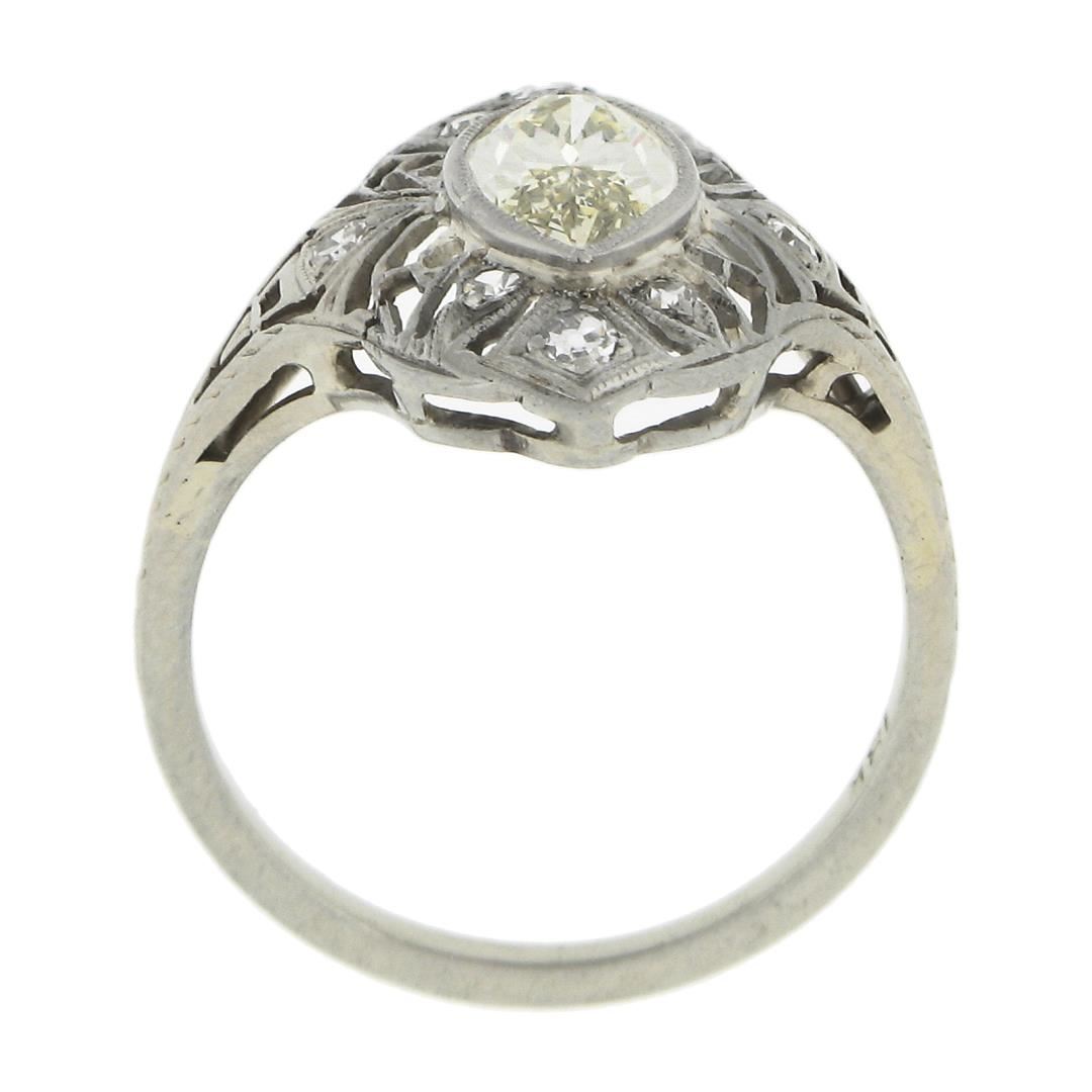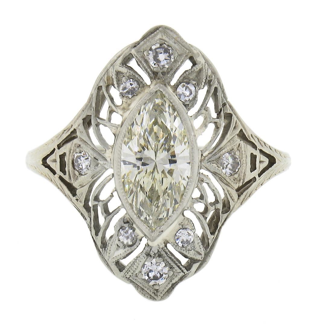 An antique solid 18k white gold ring, with 1 GIA graded marquise cut natural diamond (U- V - SI1 ; 0.94ct), and 8 old single cut natural diamonds (H/I - VS2-SI2 ; 0.12ctw). The ring is size 6.0, weighs a total of 2.99 grams, and measures 19.4mm wide. Comes with all original relevant certifications.