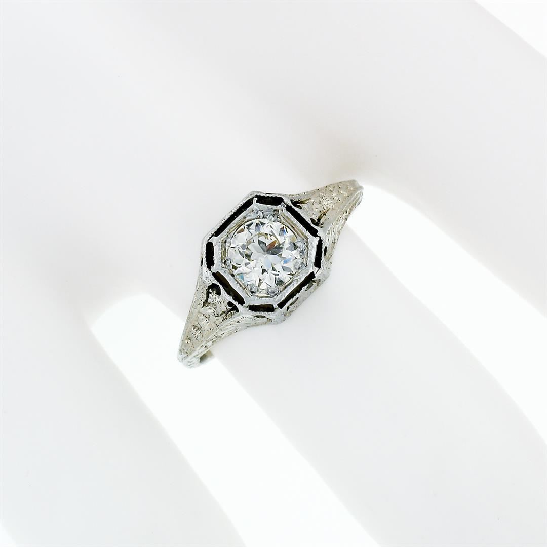 An art deco period solid 18k white gold engagement ring by Belais with an old European cut natural diamond (H - VS2; 0.50ct). The ring is size 6.0, weighs a total of 2.45 grams, and measures 8mm wide.