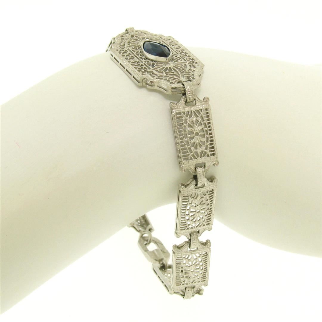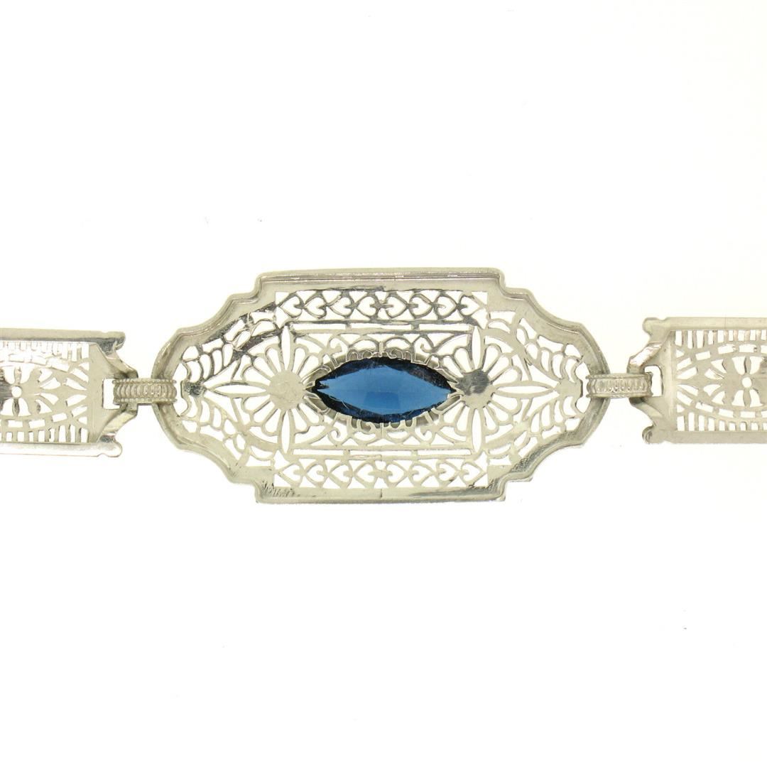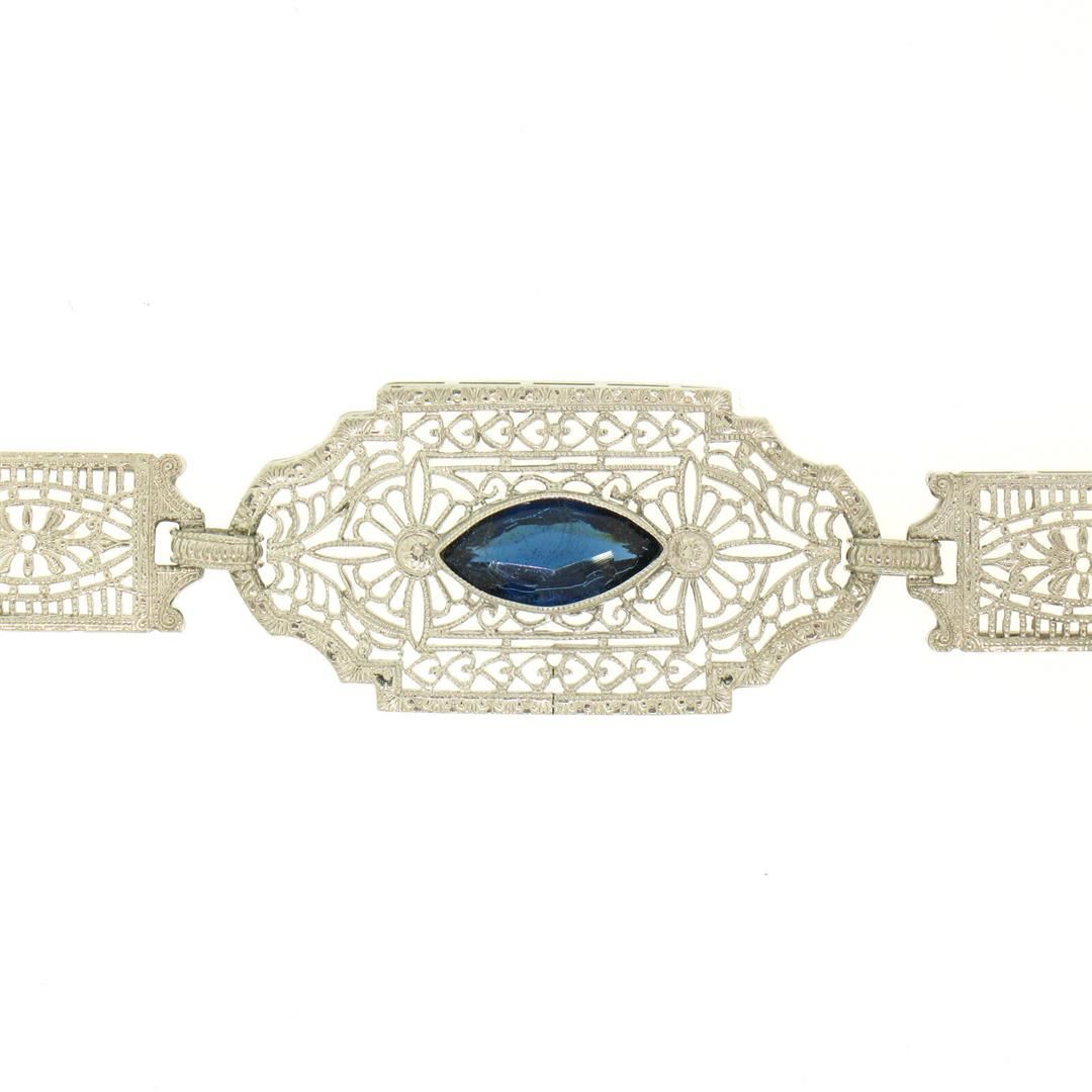 An antique solid 10k white gold filigree link bracelet, with 1 marquise cur natural sapphire (10.16x5.08mm). It weighs a total of 7.5 grams, measures 15.20mm wide, and measures 7 inches in length.