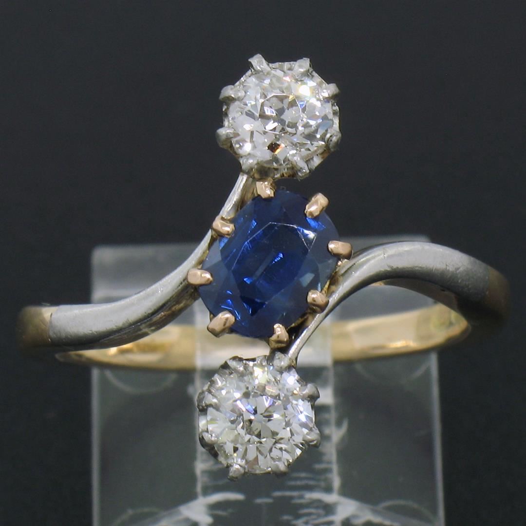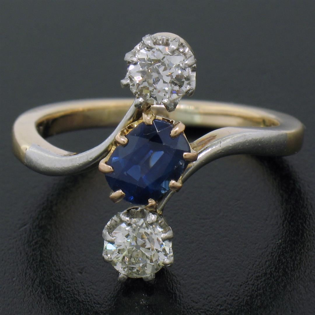 An antique solid 14k rose gold and platinum bypass ring, featuring 2 old mine cut natural diamonds (G/H- VS1/VS2; 0.76ct), and 1 old oval cut natural sapphire (6.5x4.5mm - 0.85ct). The ring is size 7.5, weighs a total of 5.15 grams.