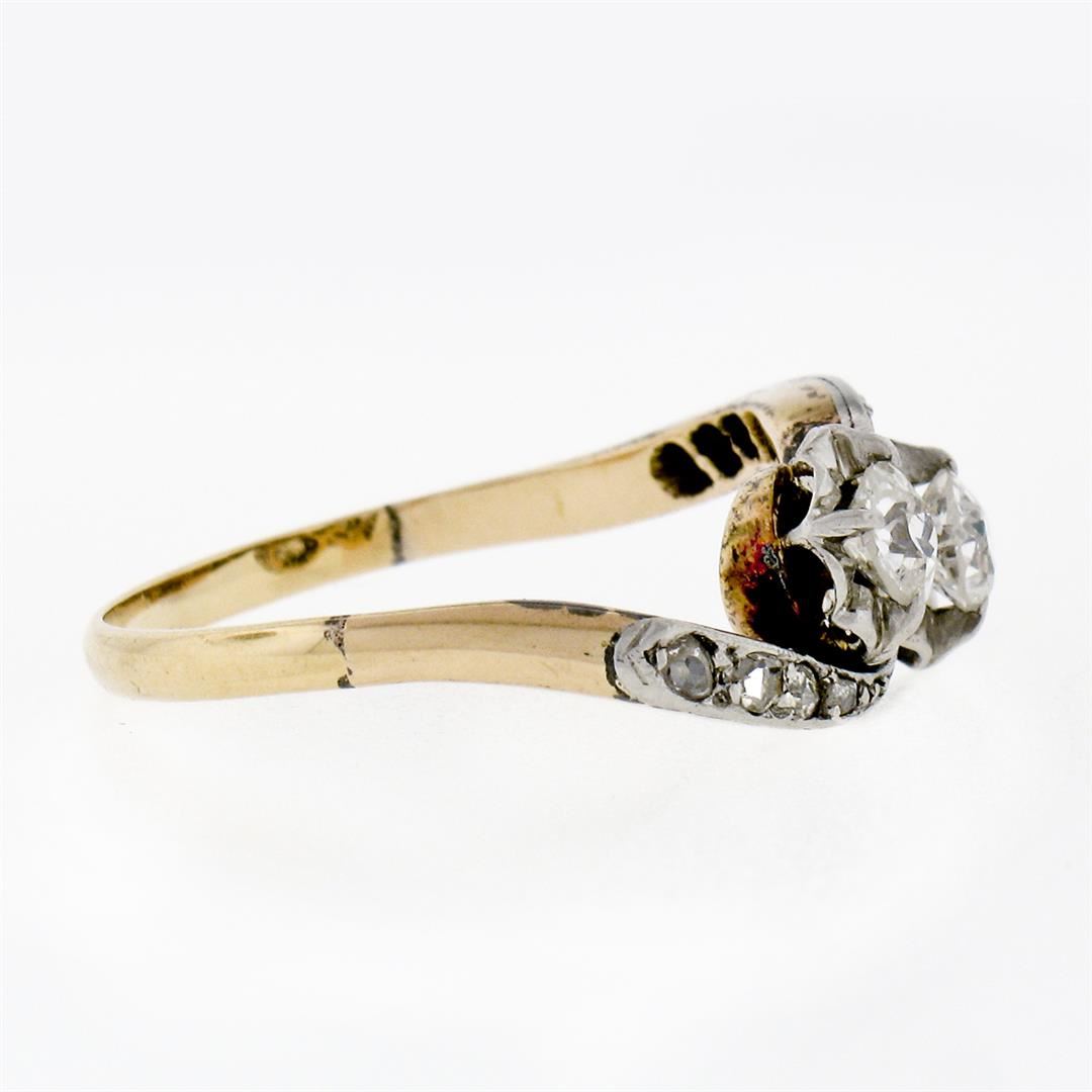 An antique solid 14k yellow gold and platinum top bypass ring, featuring 2 old european cut natural diamonds (G/H - SI1/SI2; 0.42ctw). and 8 rose cut natural diamonds (G/H - SI1/SI2; 0.12ctw). The ring is size 7,0, weighs a total of 2.49 grams, and measures 7.30mm wide.