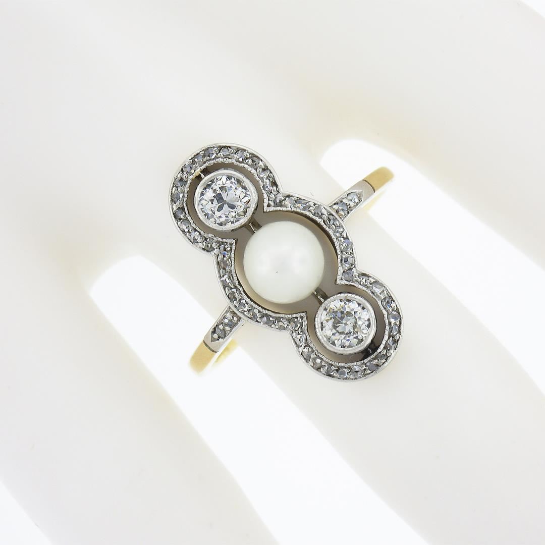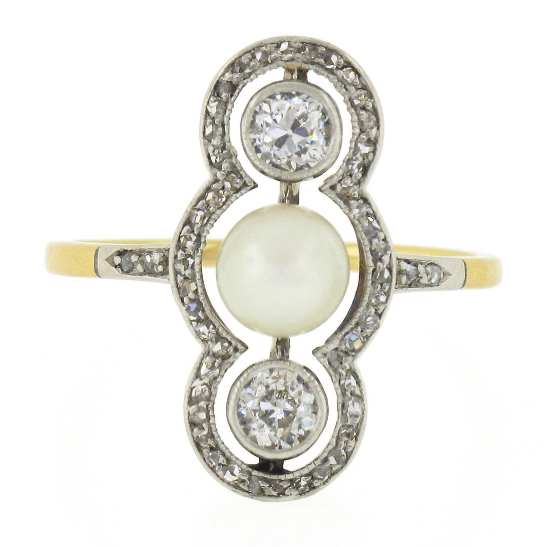 An antique solid 14k yellow gold & platinum dinner ring, with 1 round shape natural or cultured pearl (5.9mm), 2 old European cut & 50 old rose cut natural diamonds (H/I Color - SI1-I1 ; 0.82ctw). The ring is size 8.0, weighs a total of 3.50 grams, and measures 20.55mm wide.