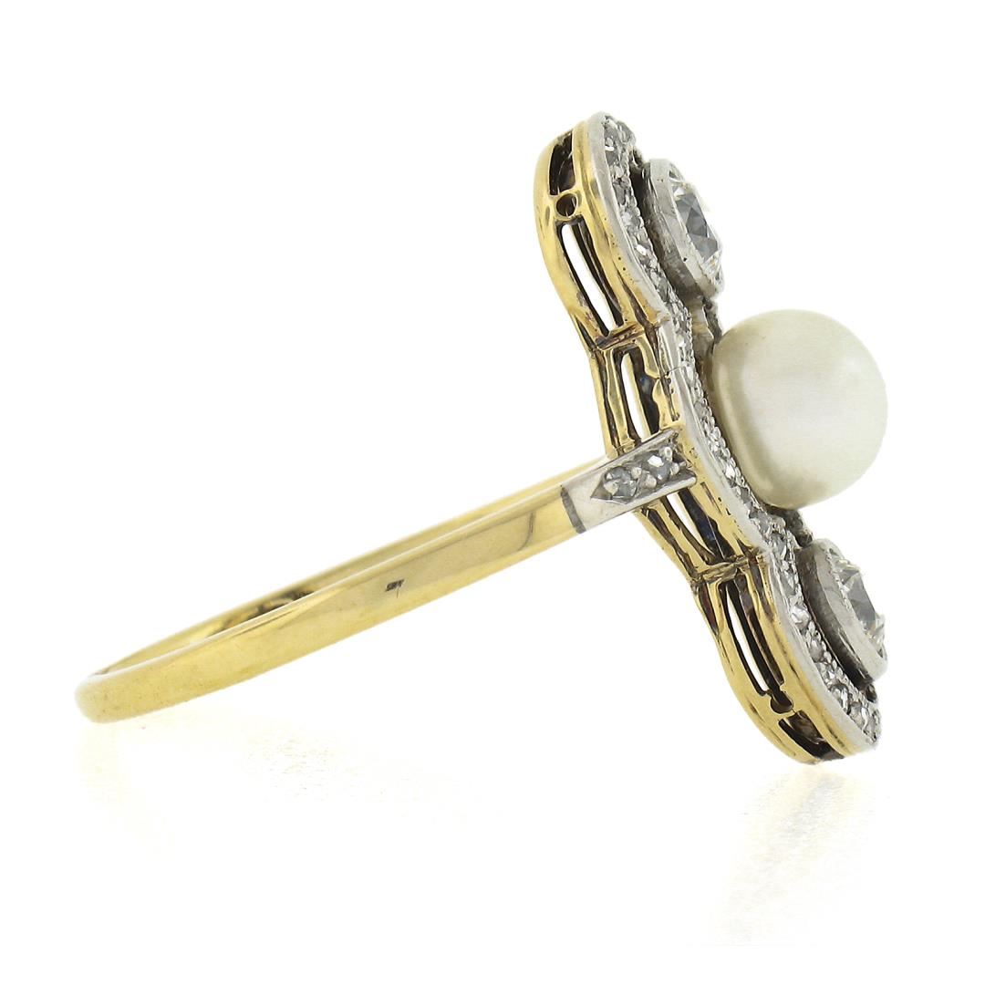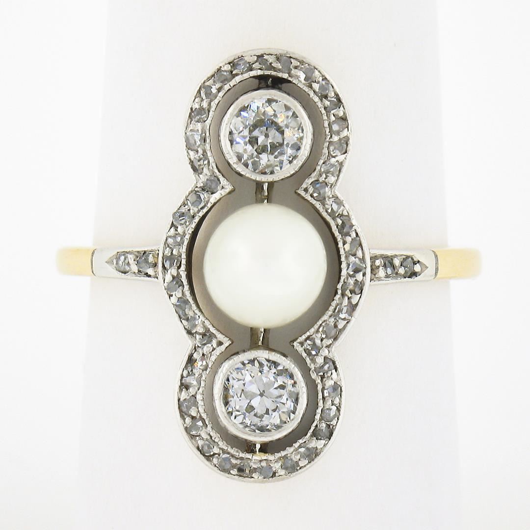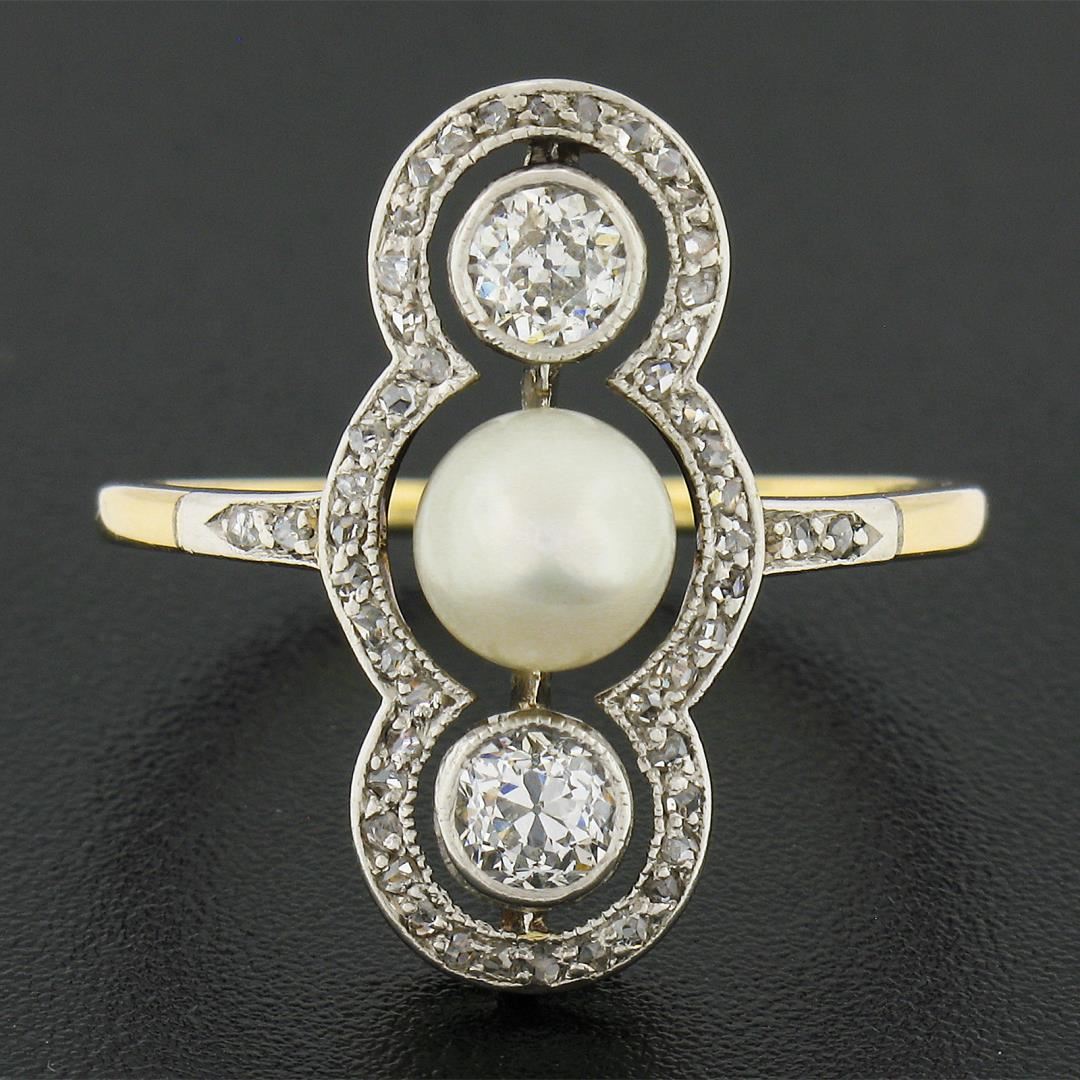 An antique solid 14k yellow gold & platinum dinner ring, with 1 round shape natural or cultured pearl (5.9mm), 2 old European cut & 50 old rose cut natural diamonds (H/I Color - SI1-I1 ; 0.82ctw). The ring is size 8.0, weighs a total of 3.50 grams, and measures 20.55mm wide.