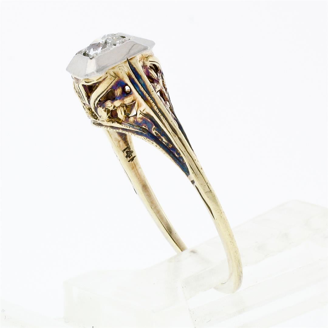 An antique edwardian solid 14k yellow & white gold engagement ring, with 1 old mine cut natural diamond (G - VS2 ; 0.15ct). The ring is size 3.5, weighs a total of 1.26 grams, and measures 6.0mm wide.