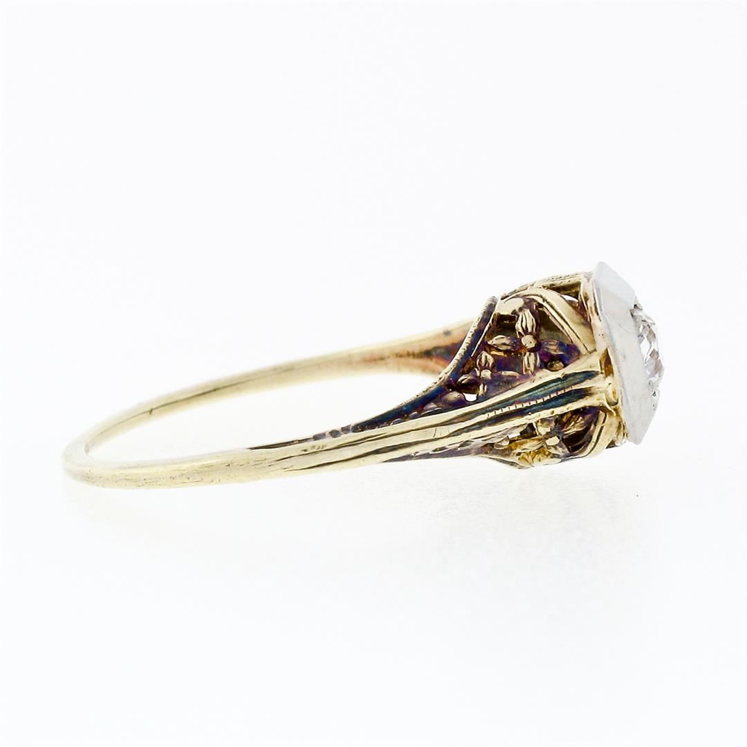 An antique edwardian solid 14k yellow & white gold engagement ring, with 1 old mine cut natural diamond (G - VS2 ; 0.15ct). The ring is size 3.5, weighs a total of 1.26 grams, and measures 6.0mm wide.