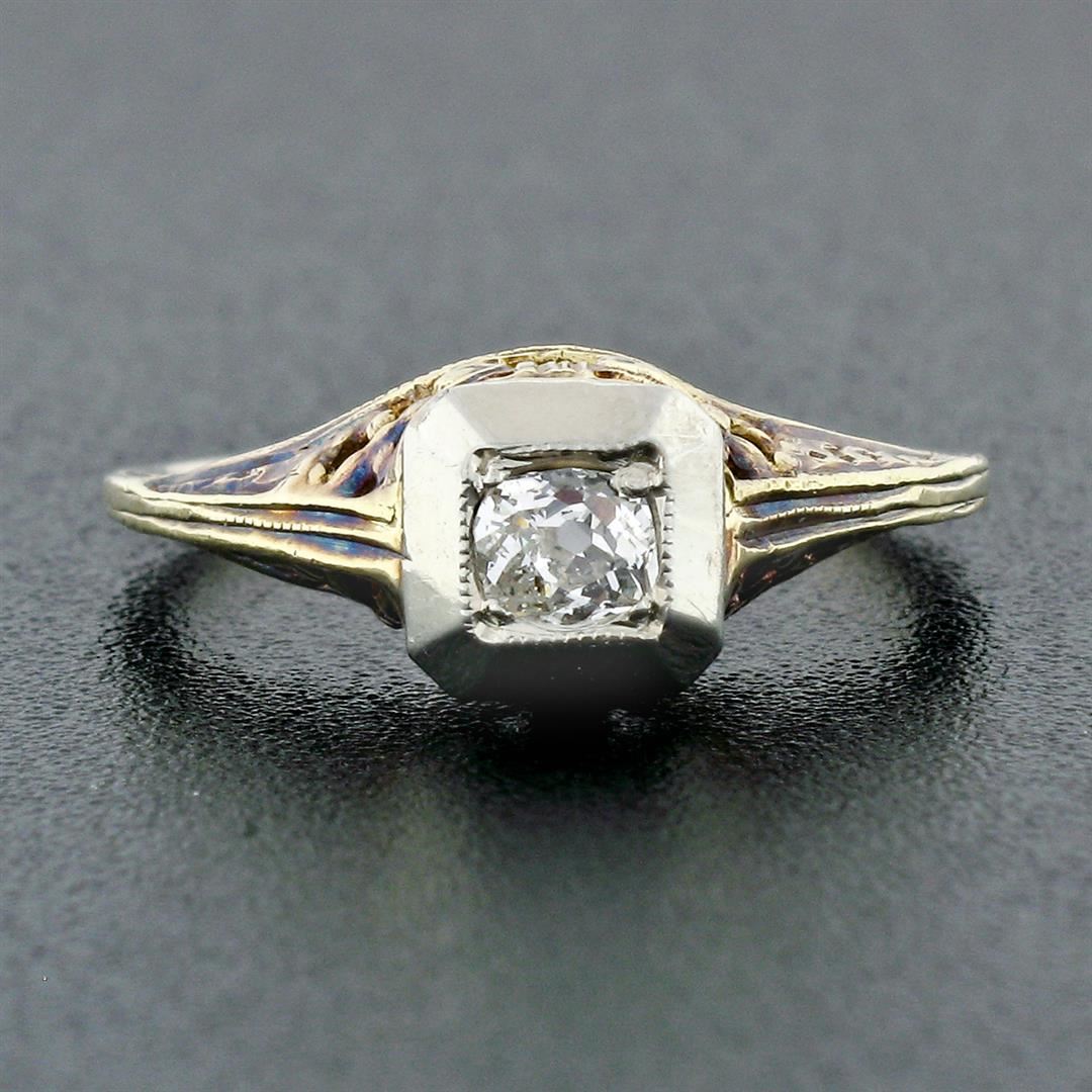 An antique edwardian solid 14k yellow & white gold engagement ring, with 1 old mine cut natural diamond (G - VS2 ; 0.15ct). The ring is size 3.5, weighs a total of 1.26 grams, and measures 6.0mm wide.