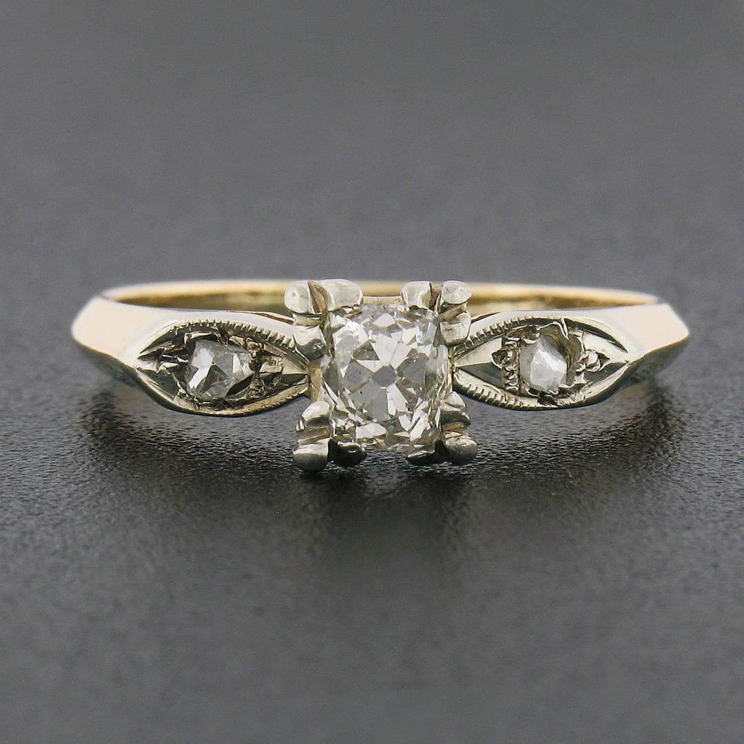 An antique solid 14k yellow & white gold engagement ring, with 1 cushion Peruzzi cut natural diamond (H - SI1 ; 0.45ct), and 2 rose cut natural diamonds (G/H - SI1/SI2 ; 0.08ctw). The ring is size 7.0, weighs a total of 2.28 grams, and measures 5.95mm wide.