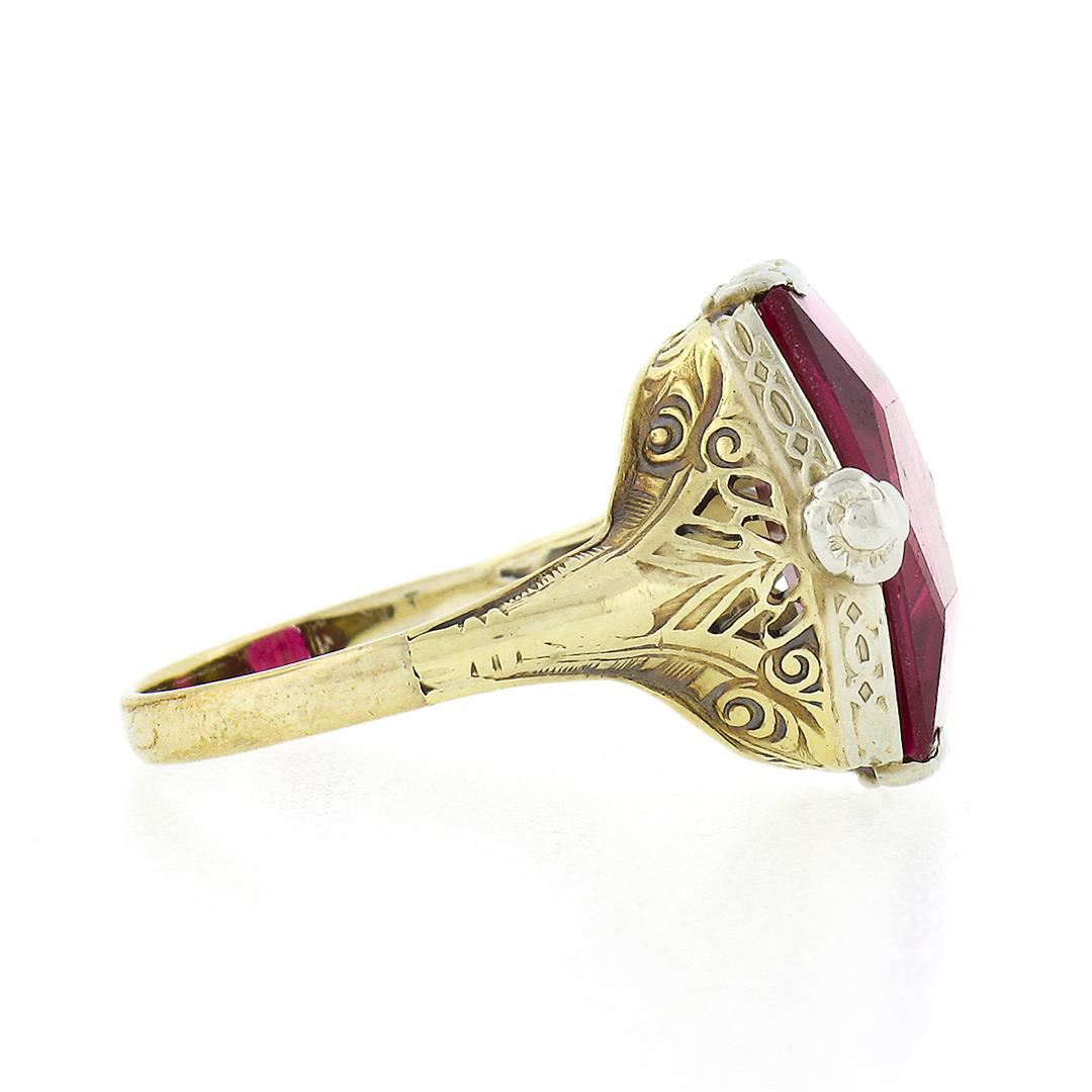 An antique solid 14k yellow & white gold ring, with 1 unique cut w/ faceted roll top red stone (15.0x9.0mm). The ring is size 7.5, weighs a total of 4.39 grams, and measures 16.60mm wide.