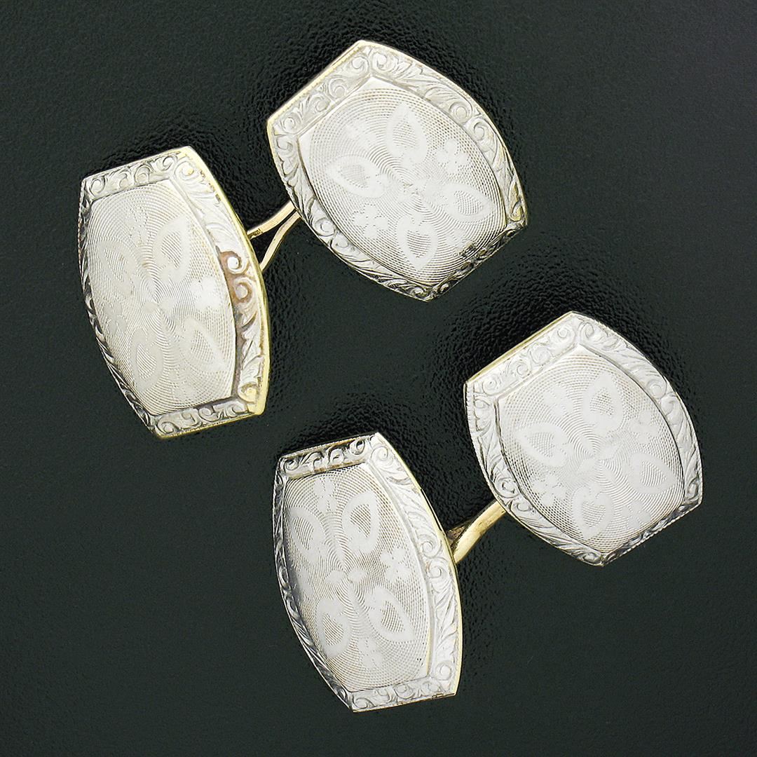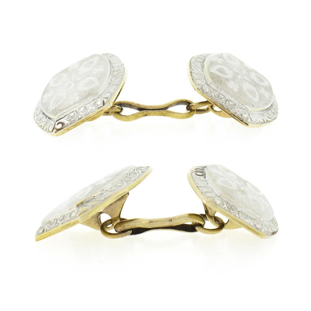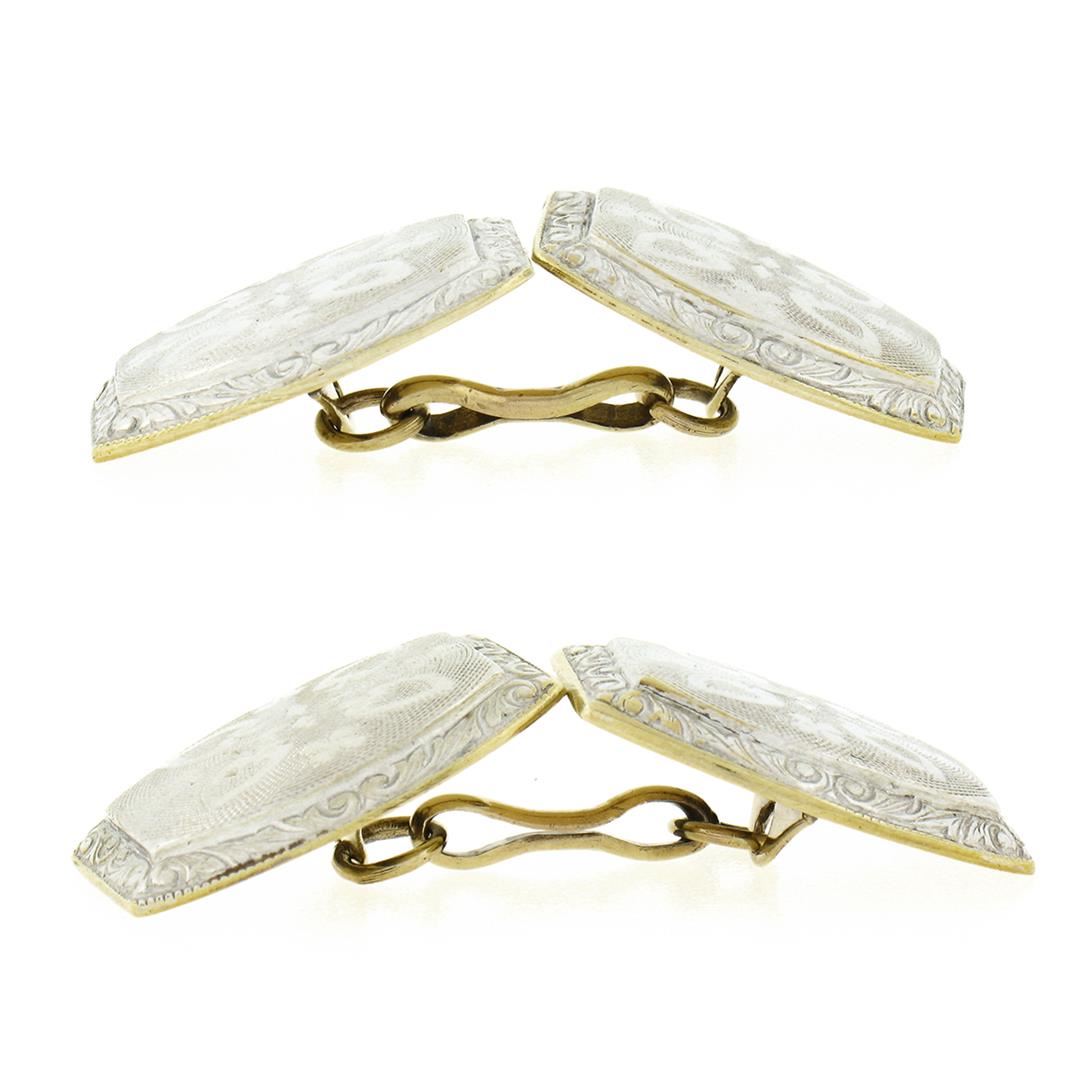An antique solid 14k white gold cufflinks. These cuff links have a channel link design with a clearance of 18.80mm, weigh a total of 6.28 grams, and the front panels measure 12.30x16.45mm.