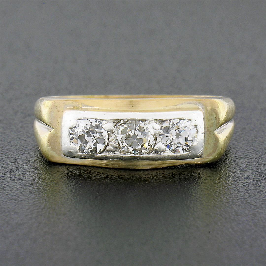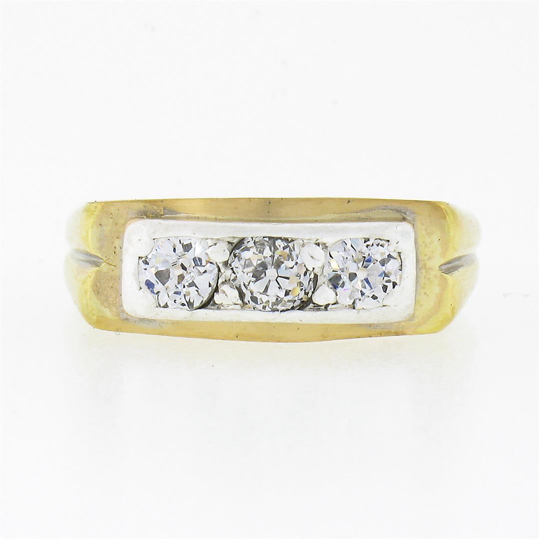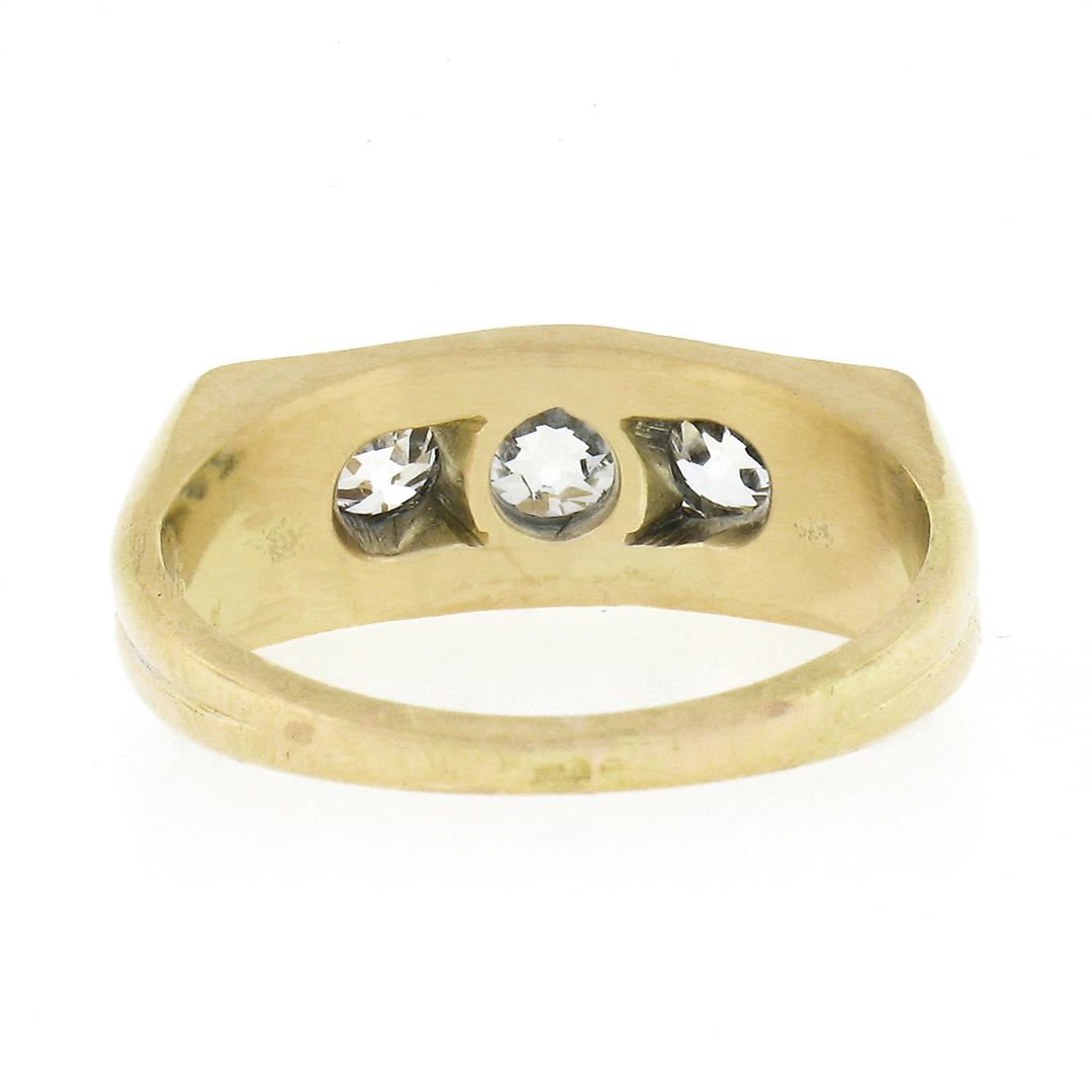 An antique soldi 14k yellow gold and silver band ring, with 3 old mine cut natural diamonds (H/I - VS2/SI2 ; 0.75ctw). The ring is size 5.0, weighs a total of 4.70 grams, and measures 6.45mm wide.