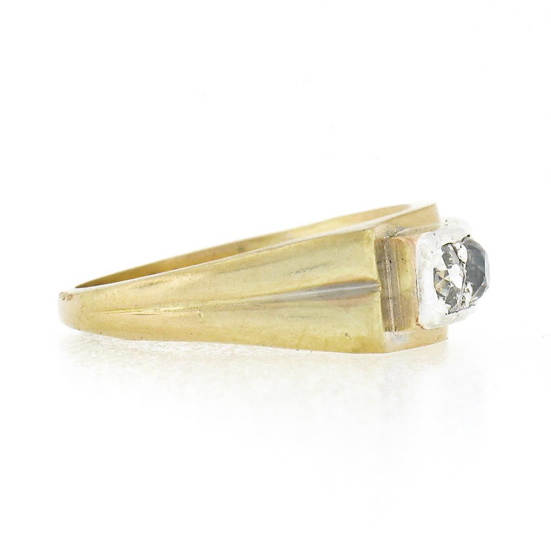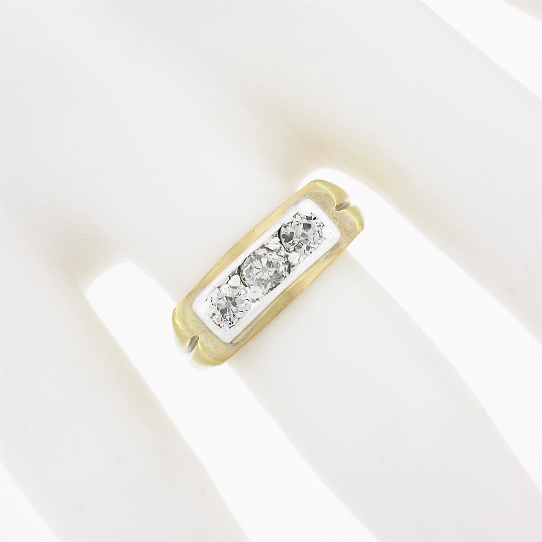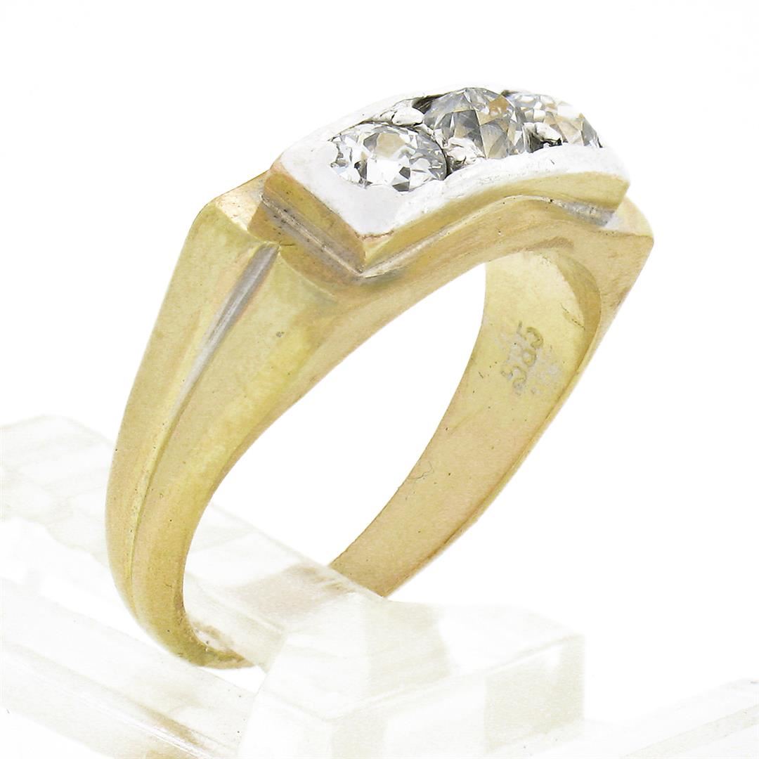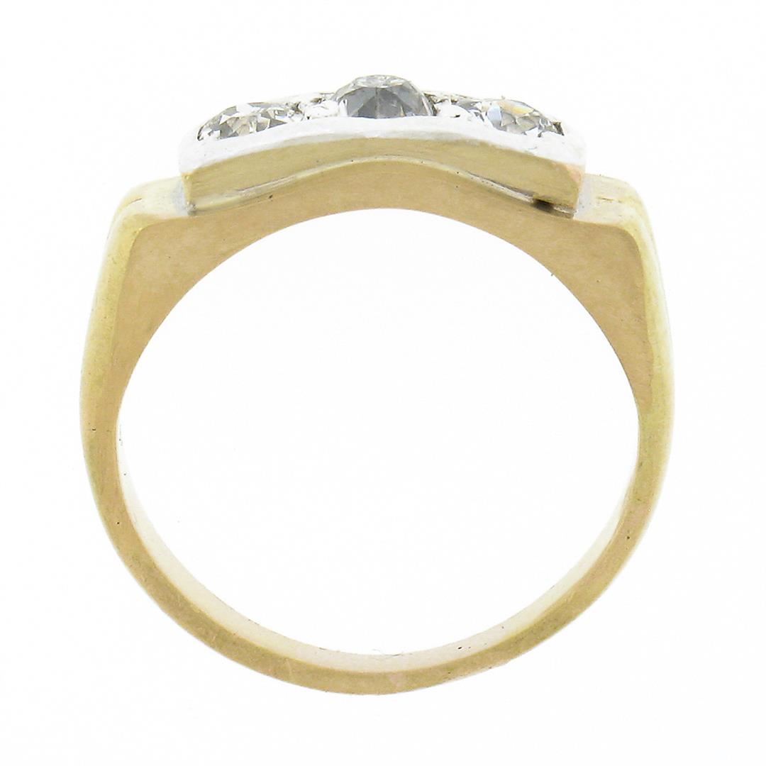 An antique soldi 14k yellow gold and silver band ring, with 3 old mine cut natural diamonds (H/I - VS2/SI2 ; 0.75ctw). The ring is size 5.0, weighs a total of 4.70 grams, and measures 6.45mm wide.