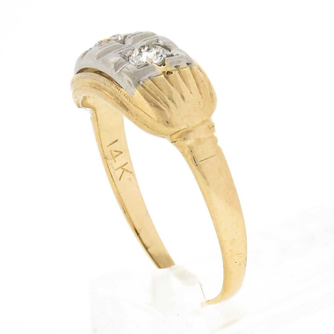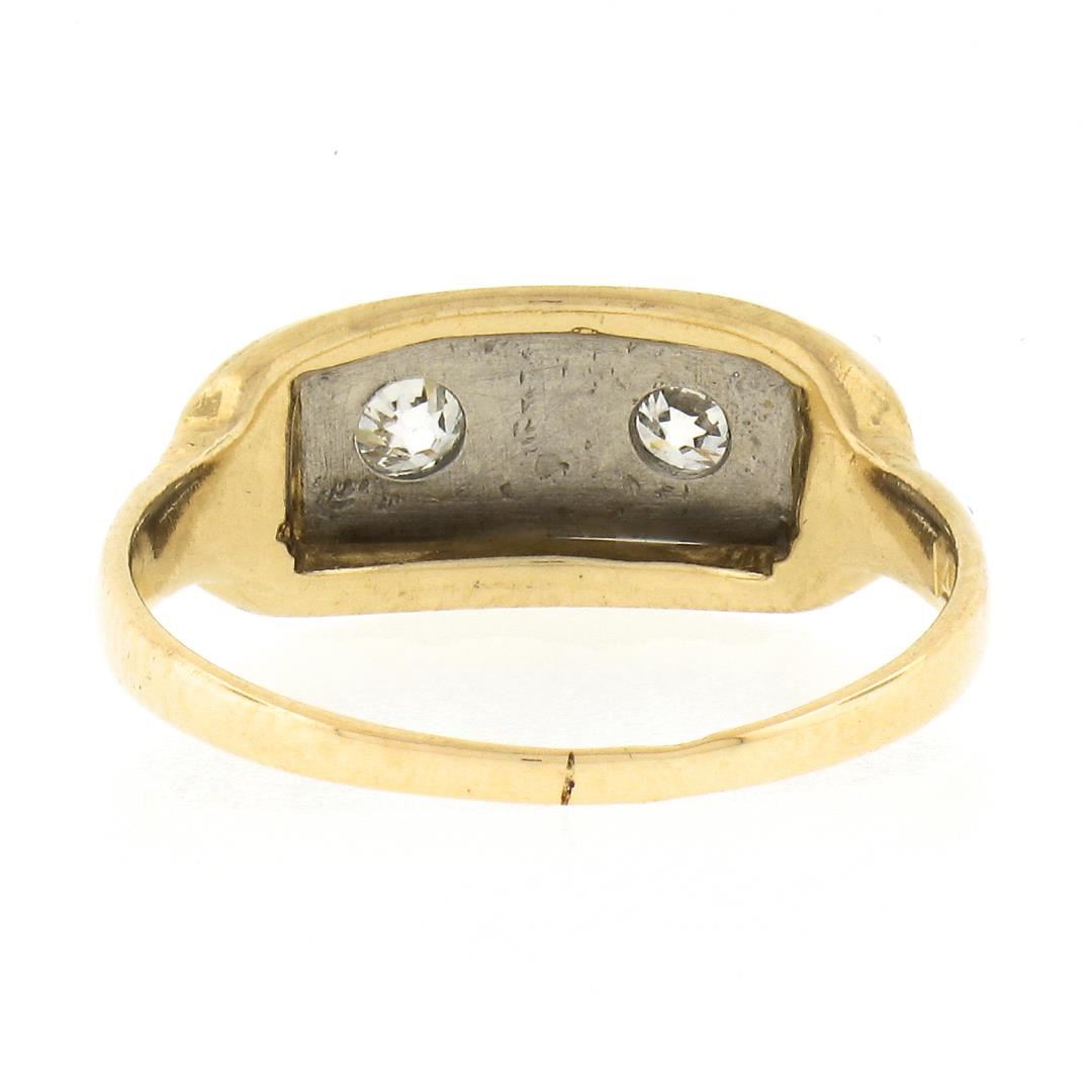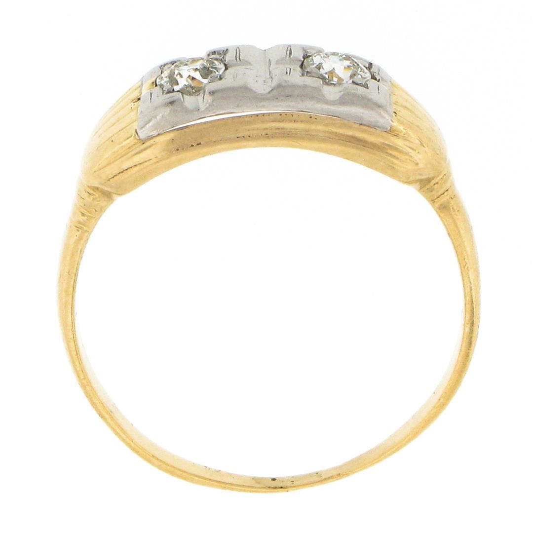 An antique solid 14k yellow & white gold band ring, with 2 old European cut natural diamonds (G/H - SI1/SI2 ; 0.20ctw). The ring is size 6.5, weighs a total of 2.57 grams, and measures 7.25mm wide.
