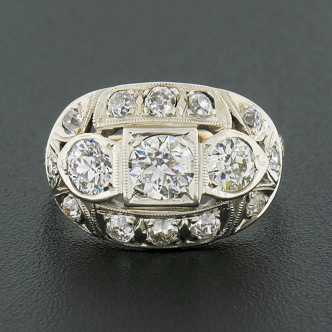An antique solid 14k yellow and white gold cocktail ring, with 3 old European cut natural diamonds (G/H - VS1/SVS2 ; 1.00ctw), and 12 old single and mine cut natural diamonds (G/H - VS1/VS2 ; 0.56ctw). The ring is size 7.0, weighs a total of 2.41 grams, and measures 12.60mm wide.