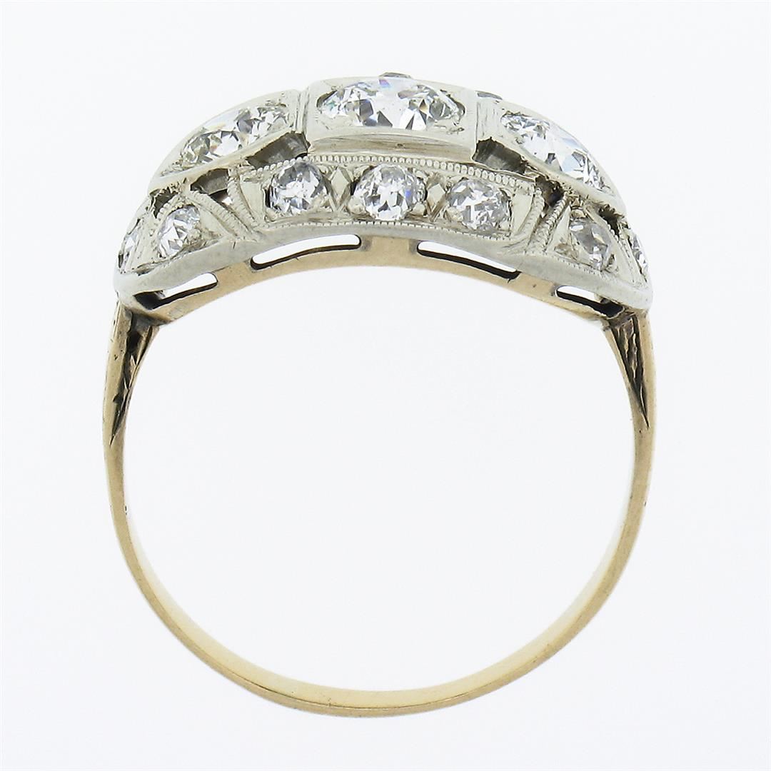 An antique solid 14k yellow and white gold cocktail ring, with 3 old European cut natural diamonds (G/H - VS1/SVS2 ; 1.00ctw), and 12 old single and mine cut natural diamonds (G/H - VS1/VS2 ; 0.56ctw). The ring is size 7.0, weighs a total of 2.41 grams, and measures 12.60mm wide.