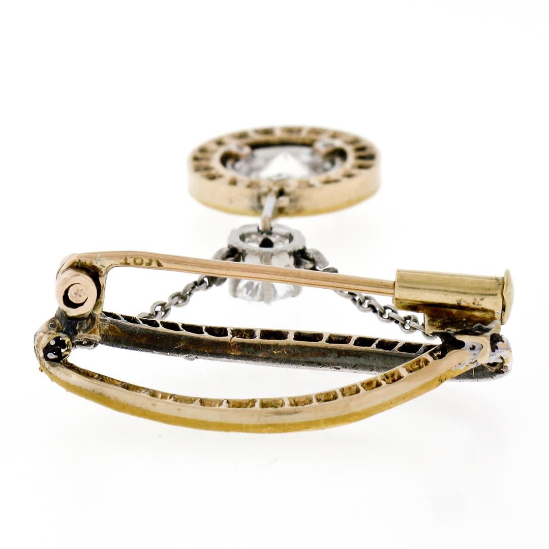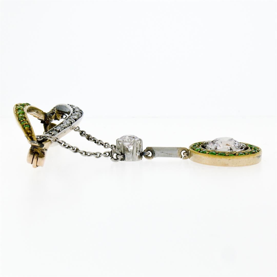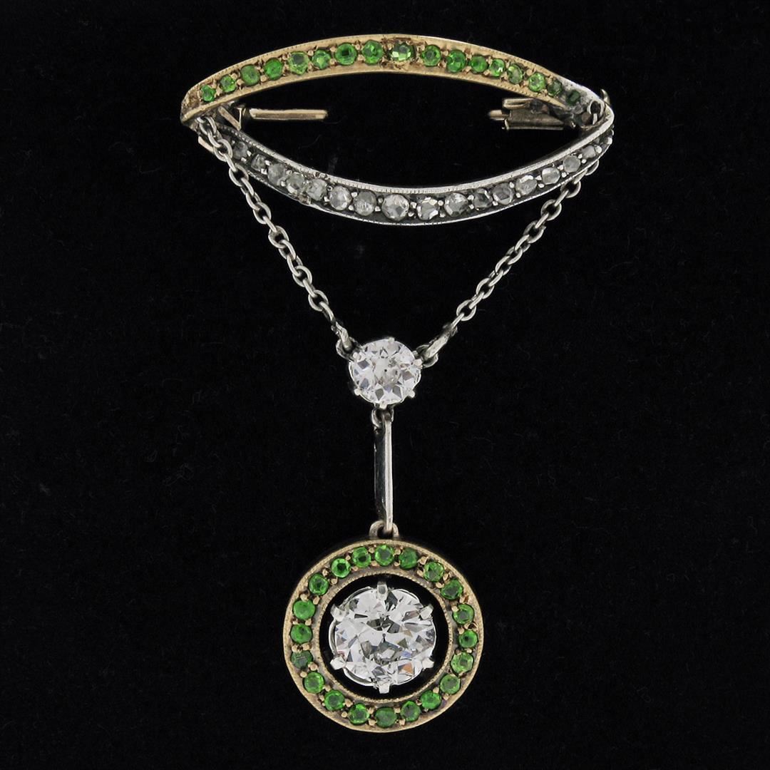 An antique victorian solid 18k yelloe gold and silver pin brooch, featuring 1 Gia certified circular brilliant cut natural diamond (F- I1; 1.17ct), and 17 rose cut natural diamonds (0.35ctw), with 1 old european cut natural diamond (F- SI2 ; 0.35ct), and 37 old cut natural demantoid garnets (0.66ctw). Measures 22.5x14.75mm and weighs a total of 6.89 grams. Comes with all original relevant certifications.