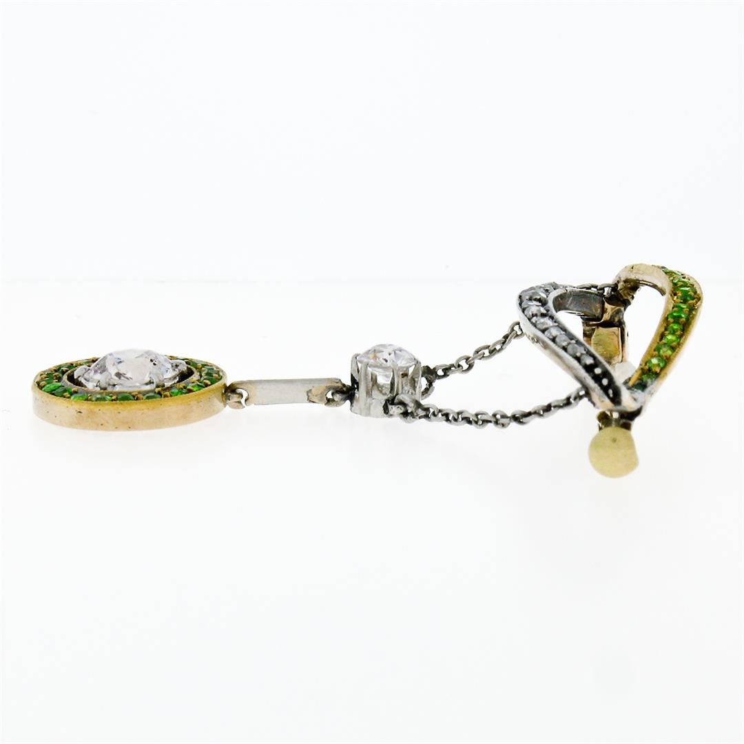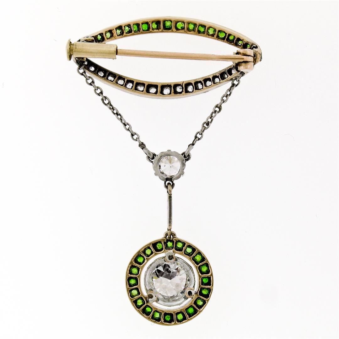 An antique victorian solid 18k yelloe gold and silver pin brooch, featuring 1 Gia certified circular brilliant cut natural diamond (F- I1; 1.17ct), and 17 rose cut natural diamonds (0.35ctw), with 1 old european cut natural diamond (F- SI2 ; 0.35ct), and 37 old cut natural demantoid garnets (0.66ctw). Measures 22.5x14.75mm and weighs a total of 6.89 grams. Comes with all original relevant certifications.