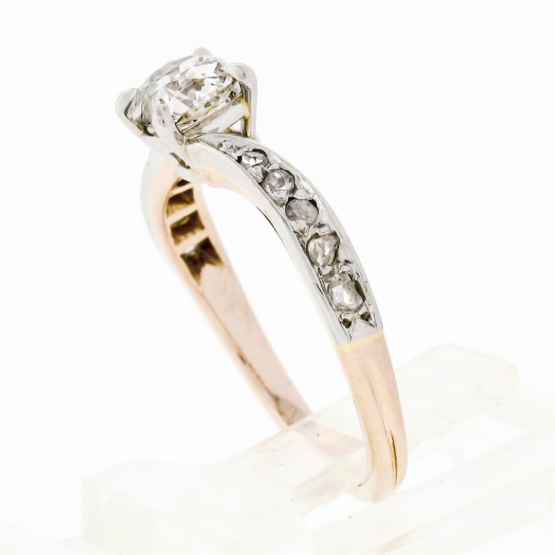 An antique edwardian solid 18k rosy yellow gold & platinum wavy engagement ring, with 1 old mine cushion cut natural diamond (I - SI2 ; 0.75ct ), and 10 old rose cut natural diamonds (H/I - SI1/SI2; 0.15ctw). The ring is size 5, weighs a total of 2.51 grams, and measures 5.35mm wide.