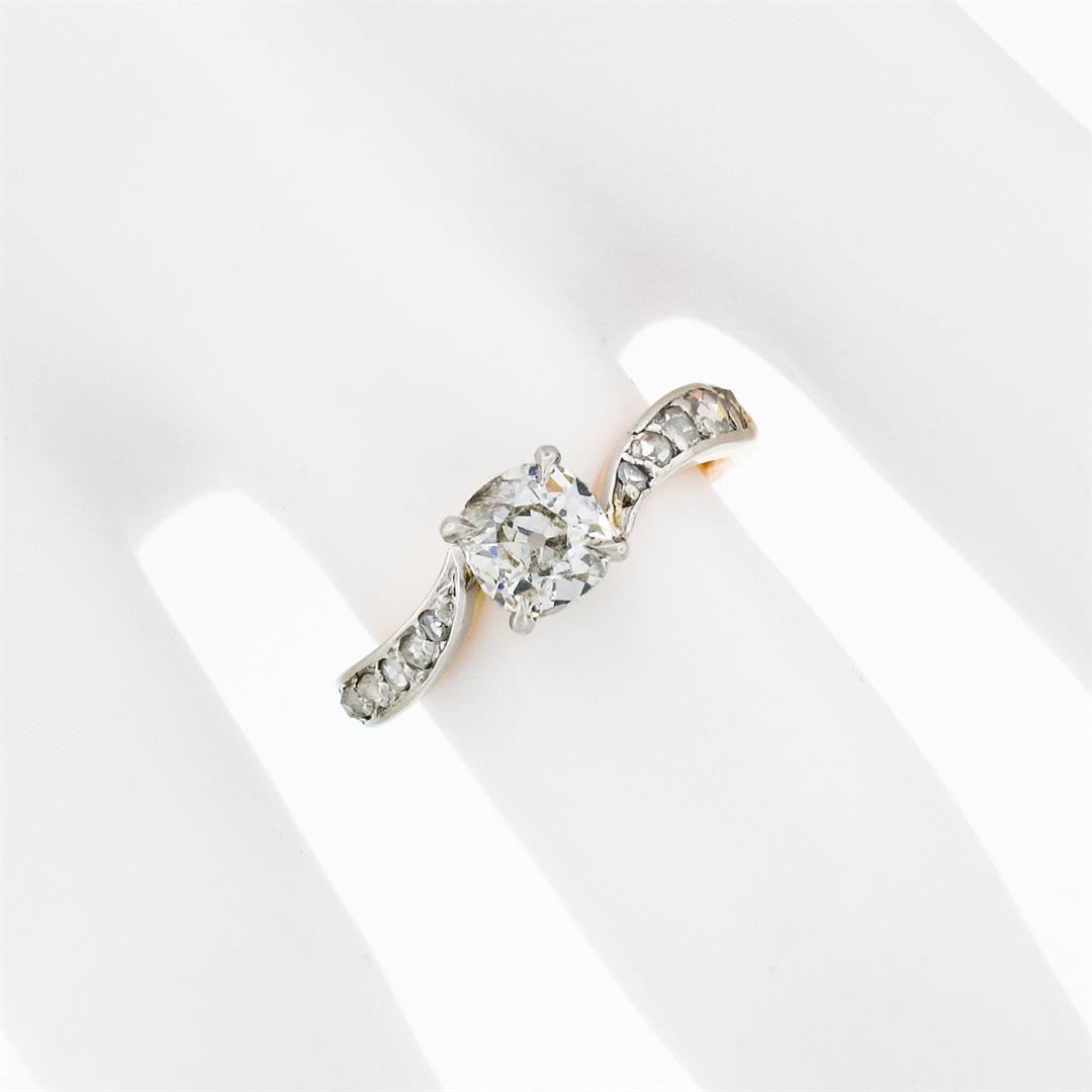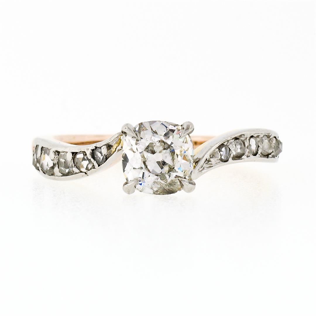 An antique edwardian solid 18k rosy yellow gold & platinum wavy engagement ring, with 1 old mine cushion cut natural diamond (I - SI2 ; 0.75ct ), and 10 old rose cut natural diamonds (H/I - SI1/SI2; 0.15ctw). The ring is size 5, weighs a total of 2.51 grams, and measures 5.35mm wide.