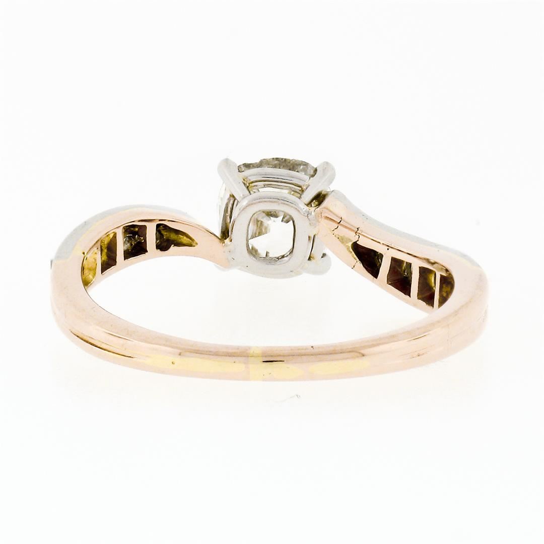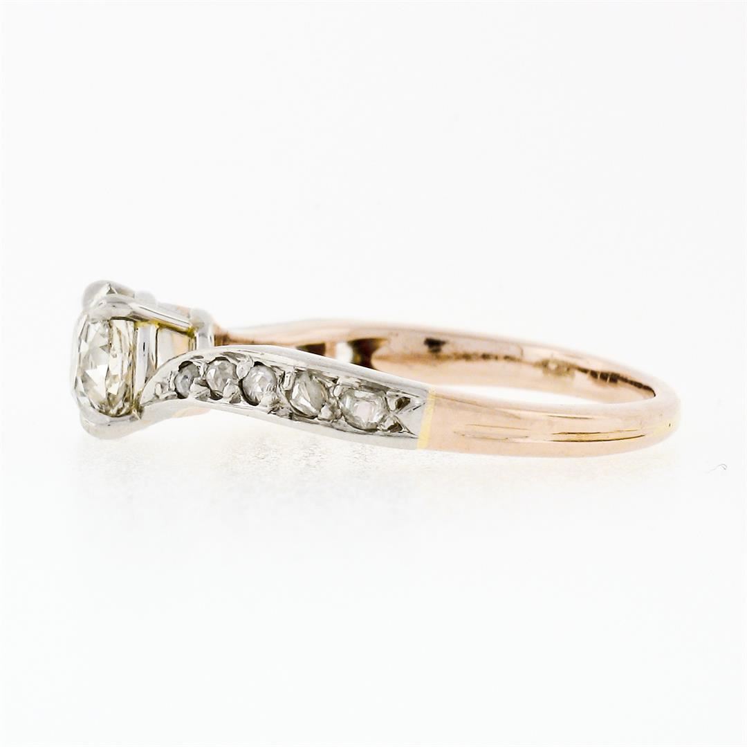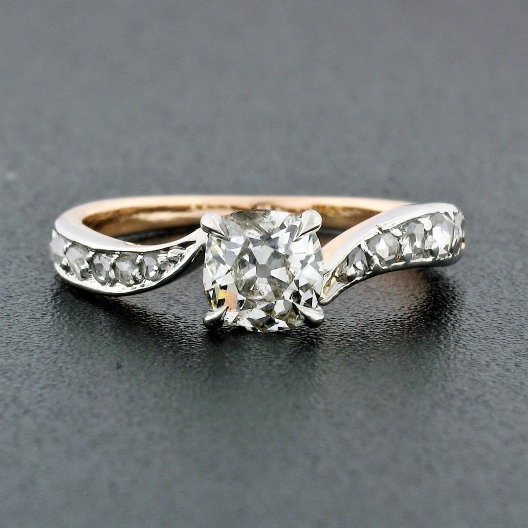 An antique edwardian solid 18k rosy yellow gold & platinum wavy engagement ring, with 1 old mine cushion cut natural diamond (I - SI2 ; 0.75ct ), and 10 old rose cut natural diamonds (H/I - SI1/SI2; 0.15ctw). The ring is size 5, weighs a total of 2.51 grams, and measures 5.35mm wide.