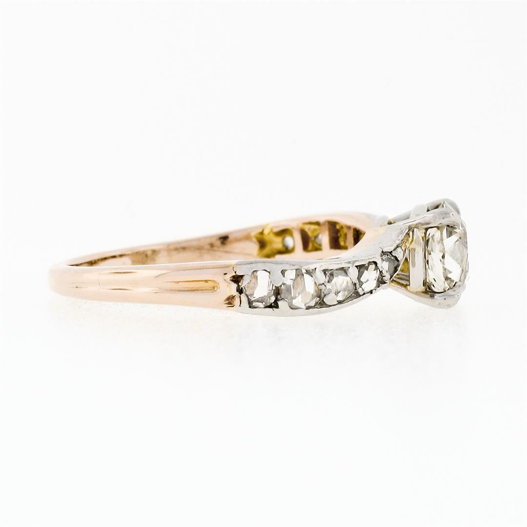 An antique edwardian solid 18k rosy yellow gold & platinum wavy engagement ring, with 1 old mine cushion cut natural diamond (I - SI2 ; 0.75ct ), and 10 old rose cut natural diamonds (H/I - SI1/SI2; 0.15ctw). The ring is size 5, weighs a total of 2.51 grams, and measures 5.35mm wide.