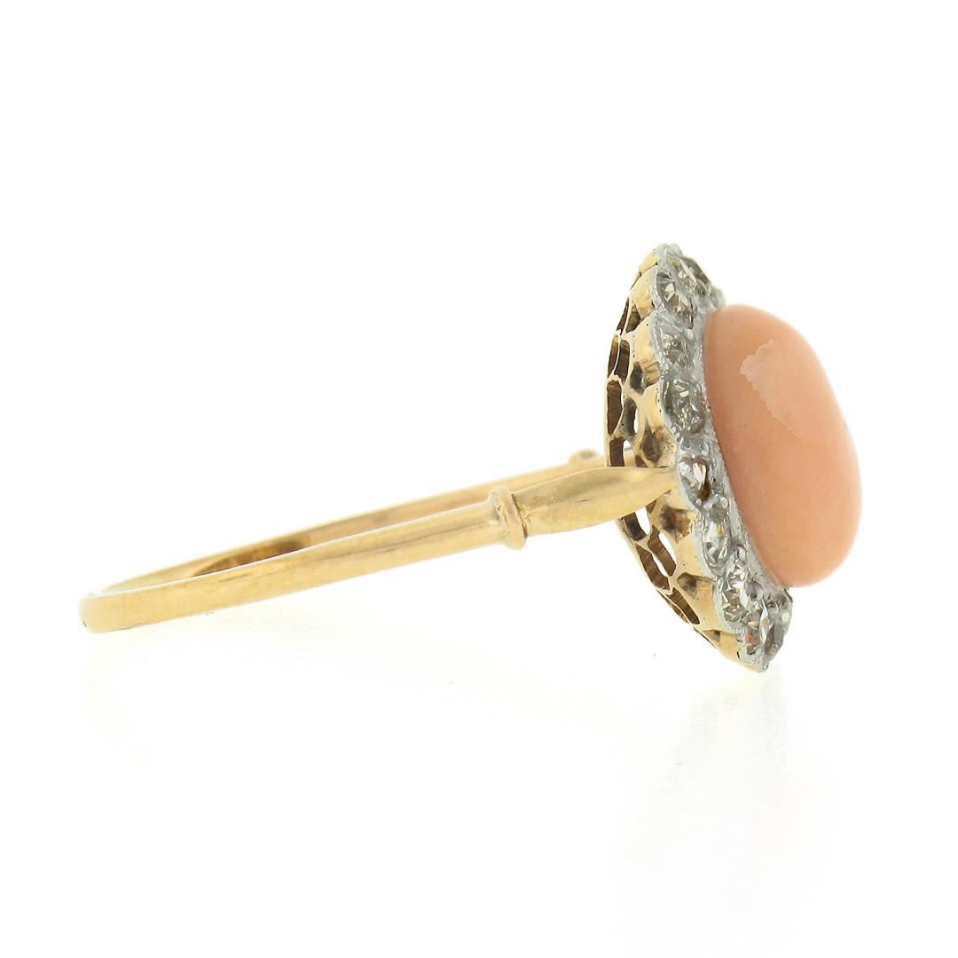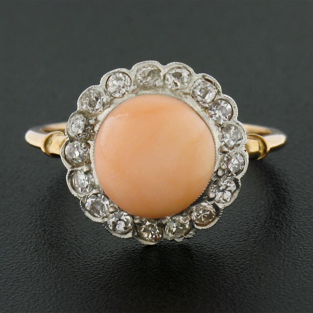 An antique solid 18k yellow gold & platinum ring, with 1 button cut natural coral (9.7mm), surrounded with a halo of 17 old mine & old single cut natural diamonds (H/K - SI1/I1 ; 0.50ctw). The ring is size 9.0, weighs a total of 3.22 grams, and measures 14.7mm wide.