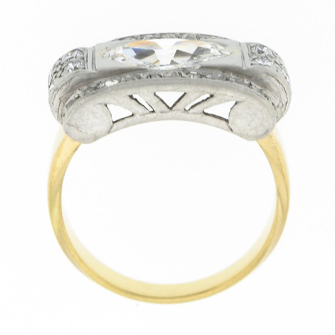 An antique solid 18k yellow gold & platinum platter ring, with 1 GIA graded oval cut natural diamond (G - SI1 ; 1.10ct ), and 30 old rose & old European cut natural diamonds (G/H - SI1/SI2 ; 0.30ctw). The ring is size 6.0, weighs a total of 7.46 grams, and measures 10.7mm wide. Comes with all original relevant certifications.