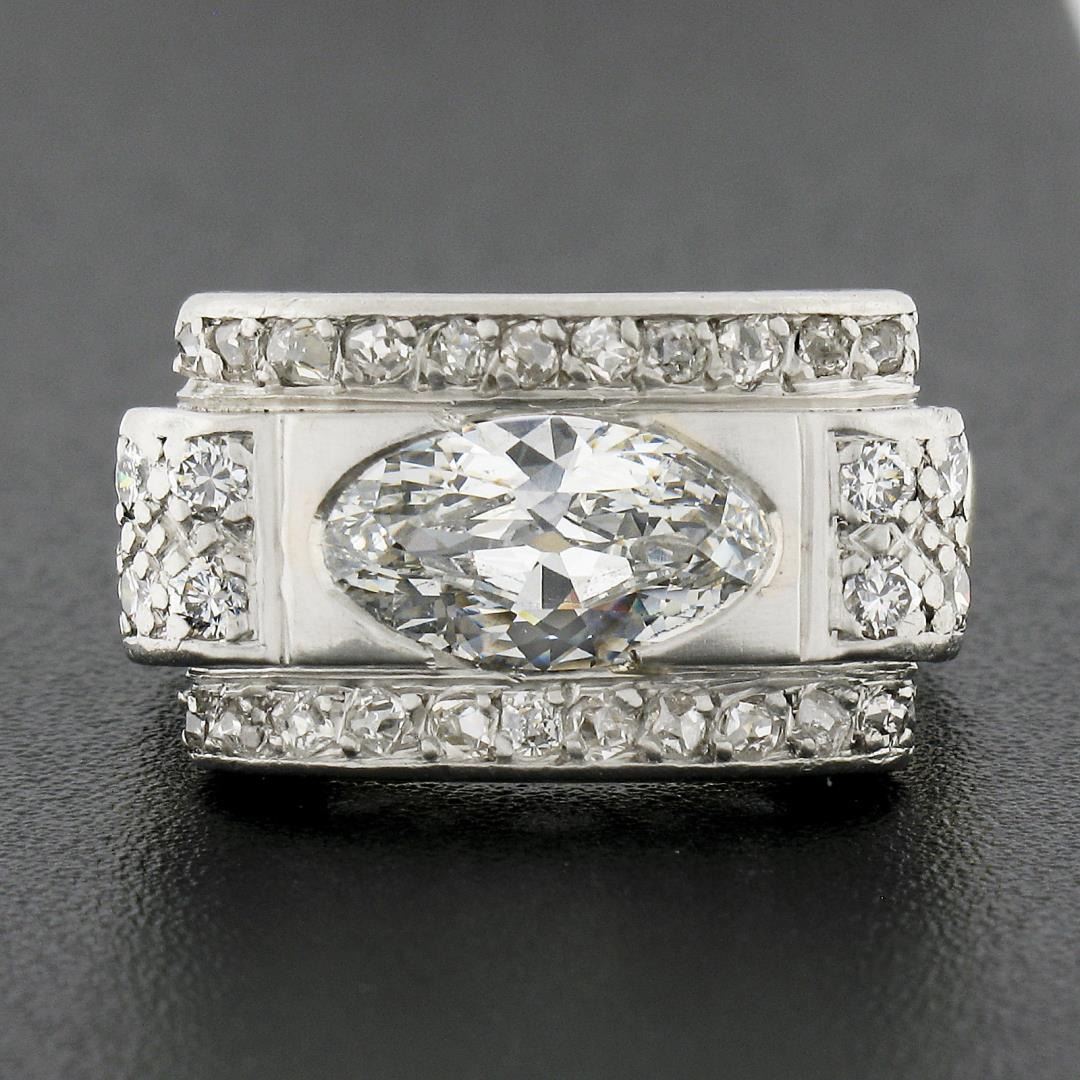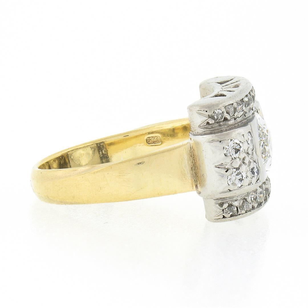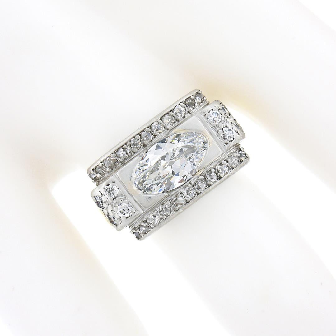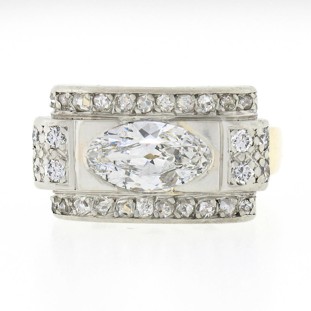An antique solid 18k yellow gold & platinum platter ring, with 1 GIA graded oval cut natural diamond (G - SI1 ; 1.10ct ), and 30 old rose & old European cut natural diamonds (G/H - SI1/SI2 ; 0.30ctw). The ring is size 6.0, weighs a total of 7.46 grams, and measures 10.7mm wide. Comes with all original relevant certifications.