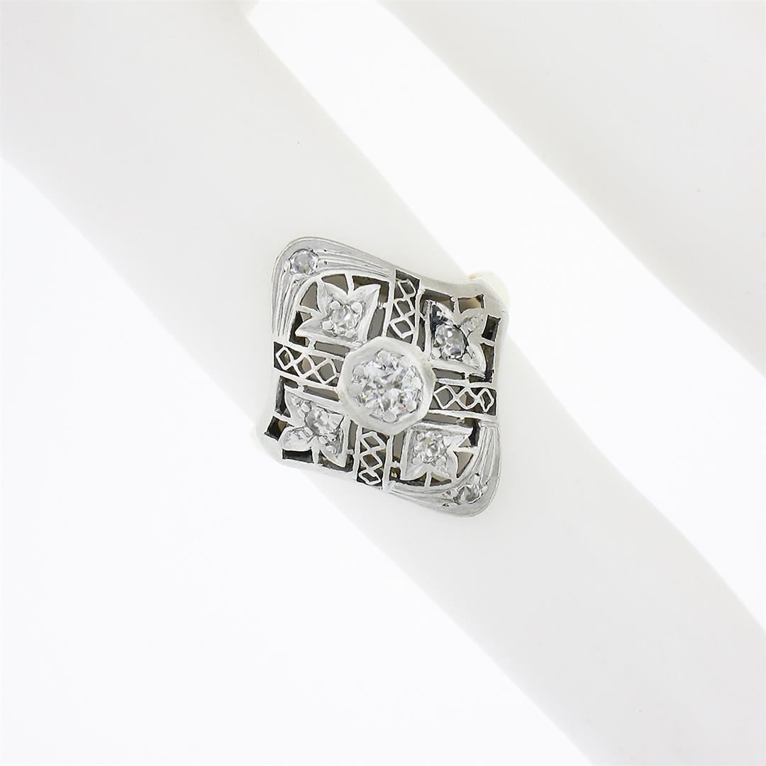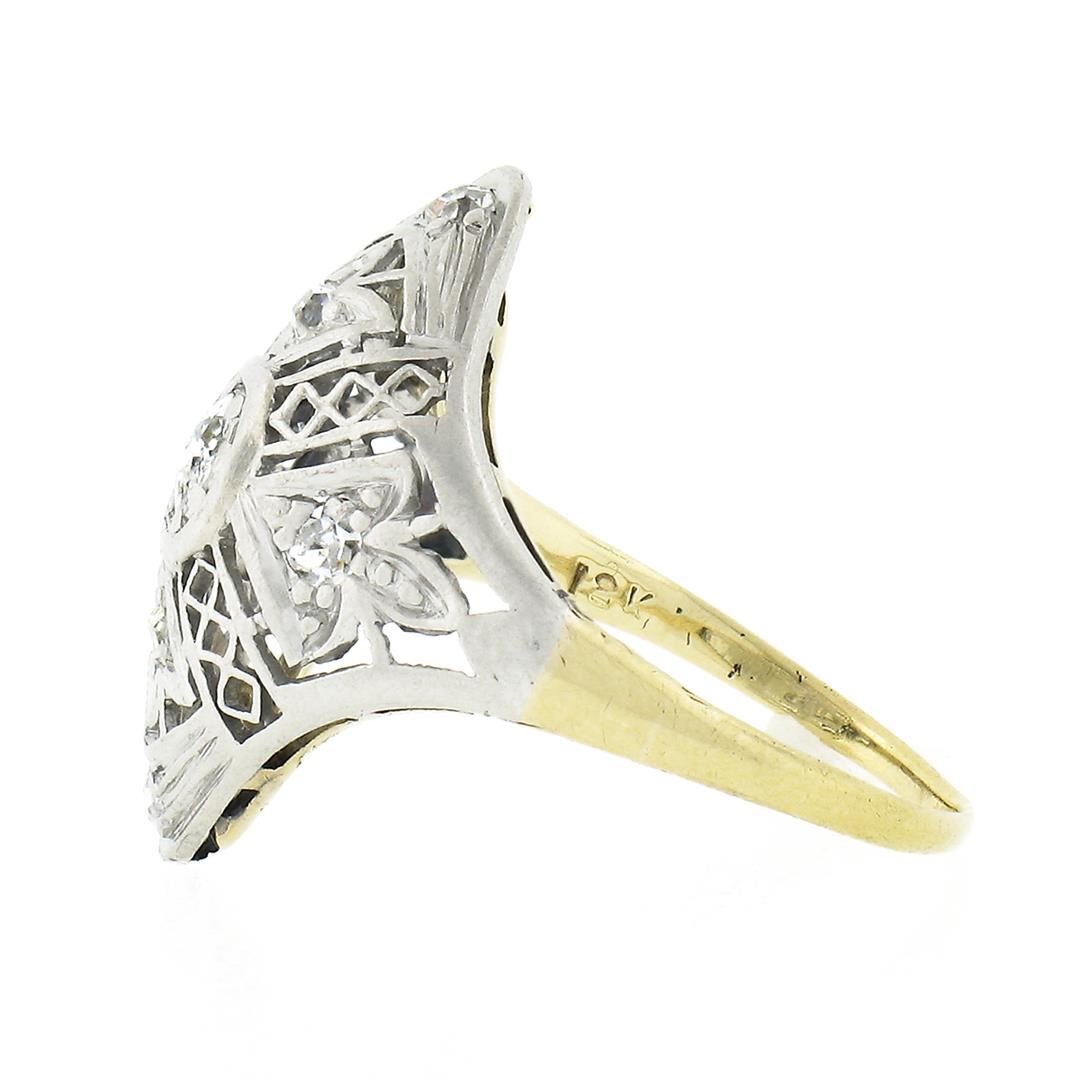 An antique solid 18k yellow gold & platinum dinner ring, with 7 old cut natural diamonds (G-I - VS2-I1 ; 0.20ctw). The ring is size 3.0, weighs a total of 1.85 grams, and measures 16.90mm wide.