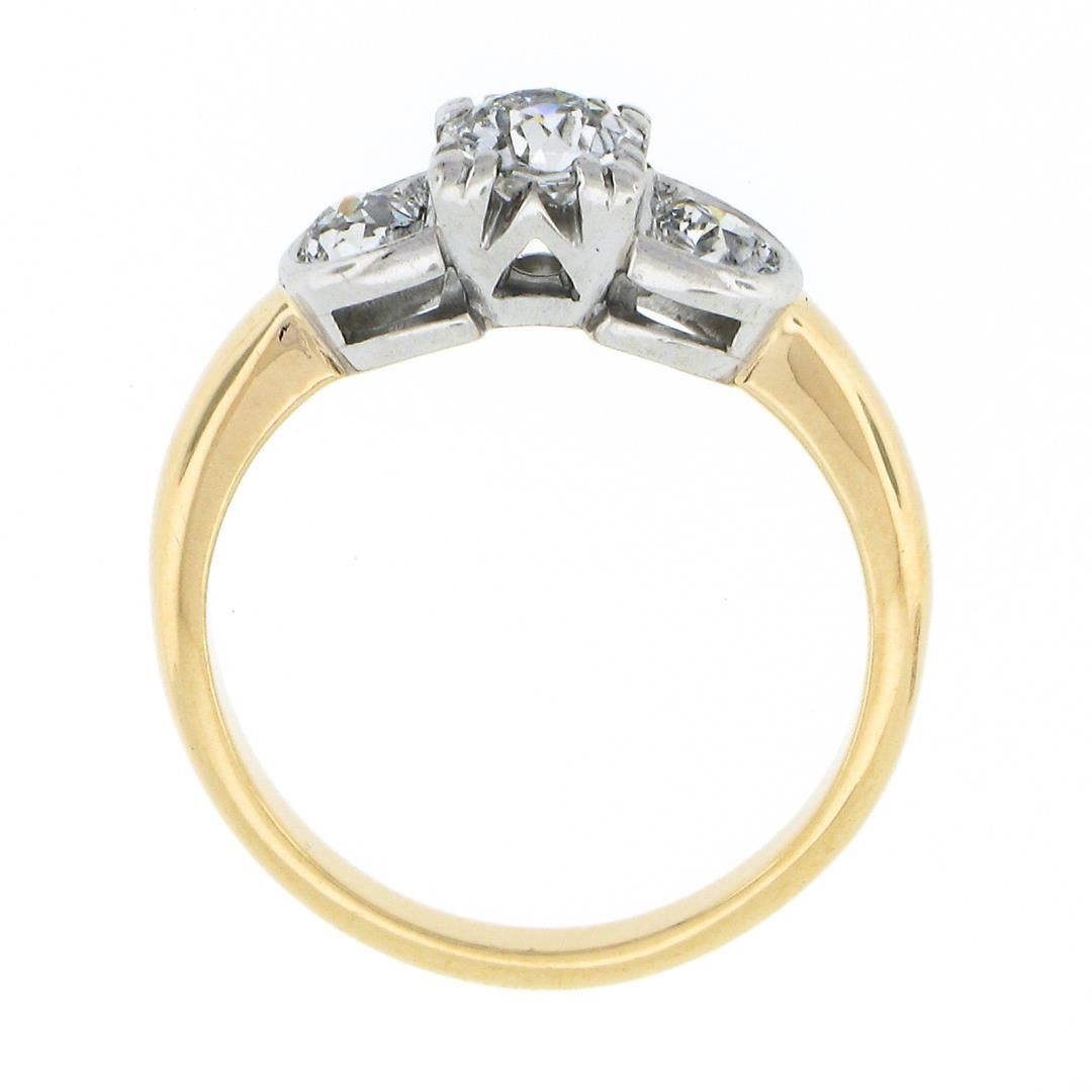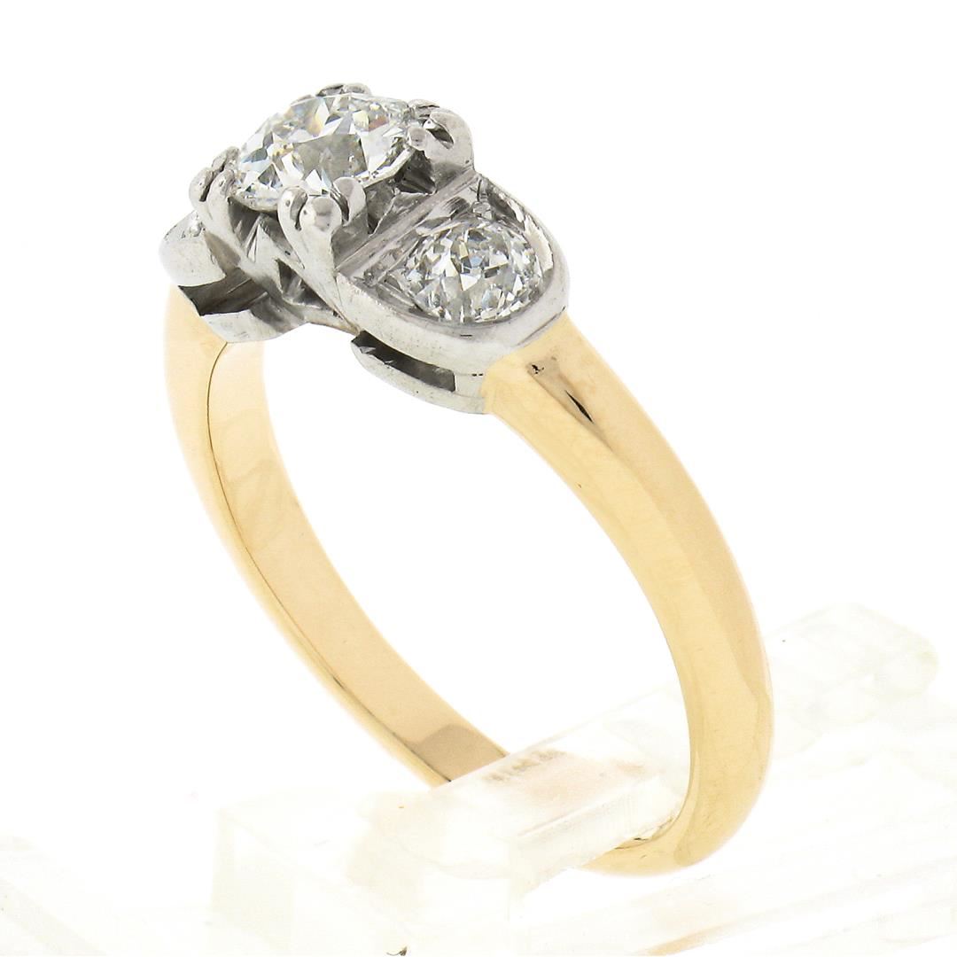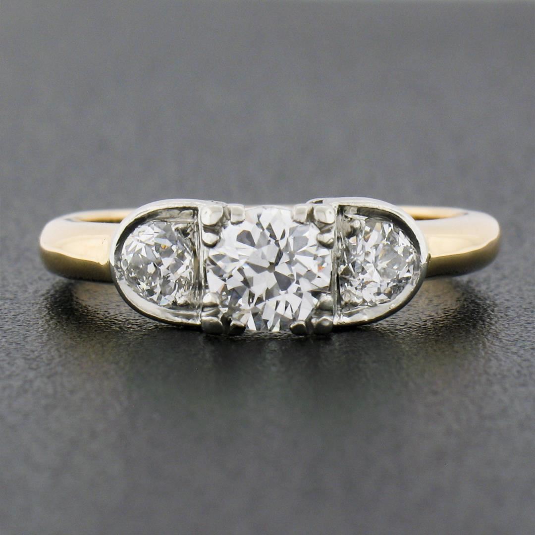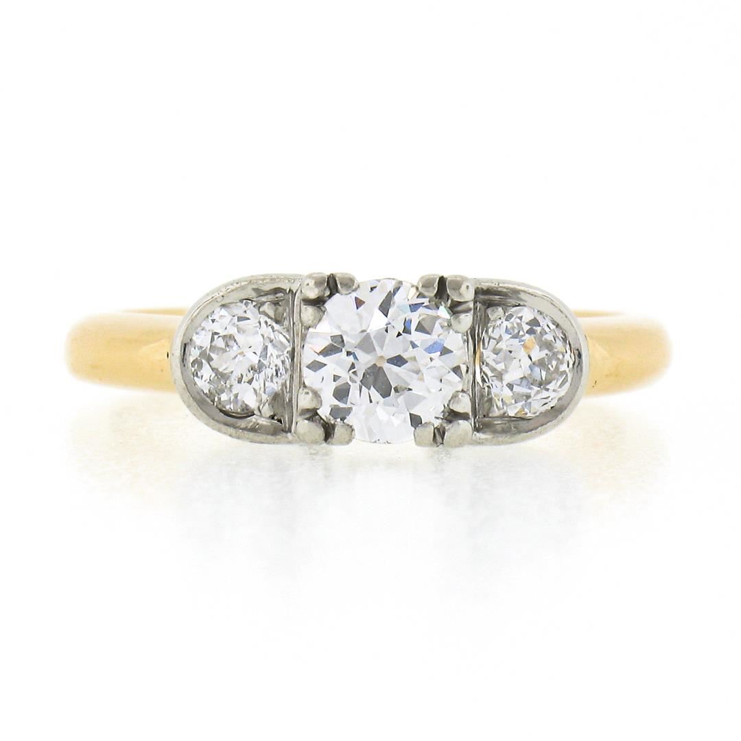 An antique solid 18k yellow gold & platinum engagement ring, with 1 old european cut natural diamond (H- VS2 - 0.55ct ), and 2 old mine cut natural diamonds (G/H - SI1/SI2 ; 0.50ctw). The ring is size 6.5, weighs a total of 4.64 grams, and measures 5.55mm wide.