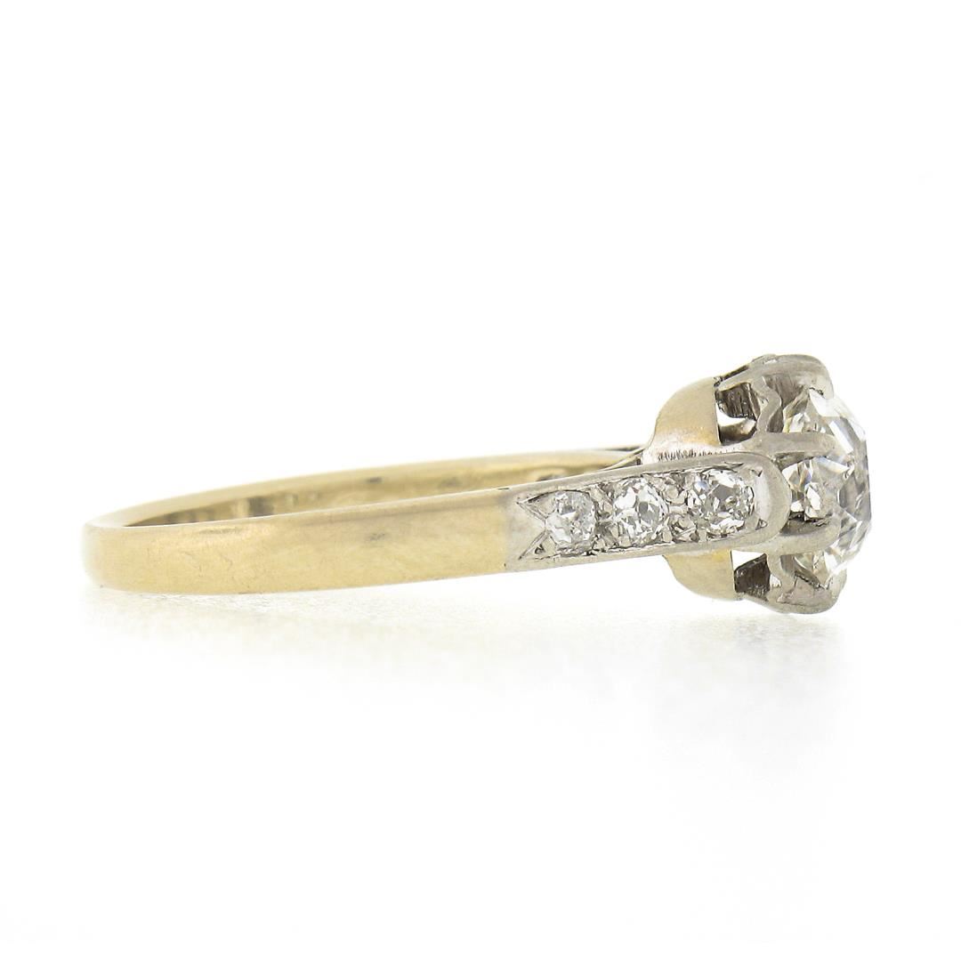 An antique solid 18k yellow gold & platinum ring, with 1 GIA graded old european cut natural diamond (H - VS2 ; 1.50ct), and 6 old mine cut natural diamonds (H/I - VS1/VS2 w/ a few SI ; 0.20ctw). . The ring is size 5.5, weighs a total of 3.81 grams, and measures 8.35mm wide.