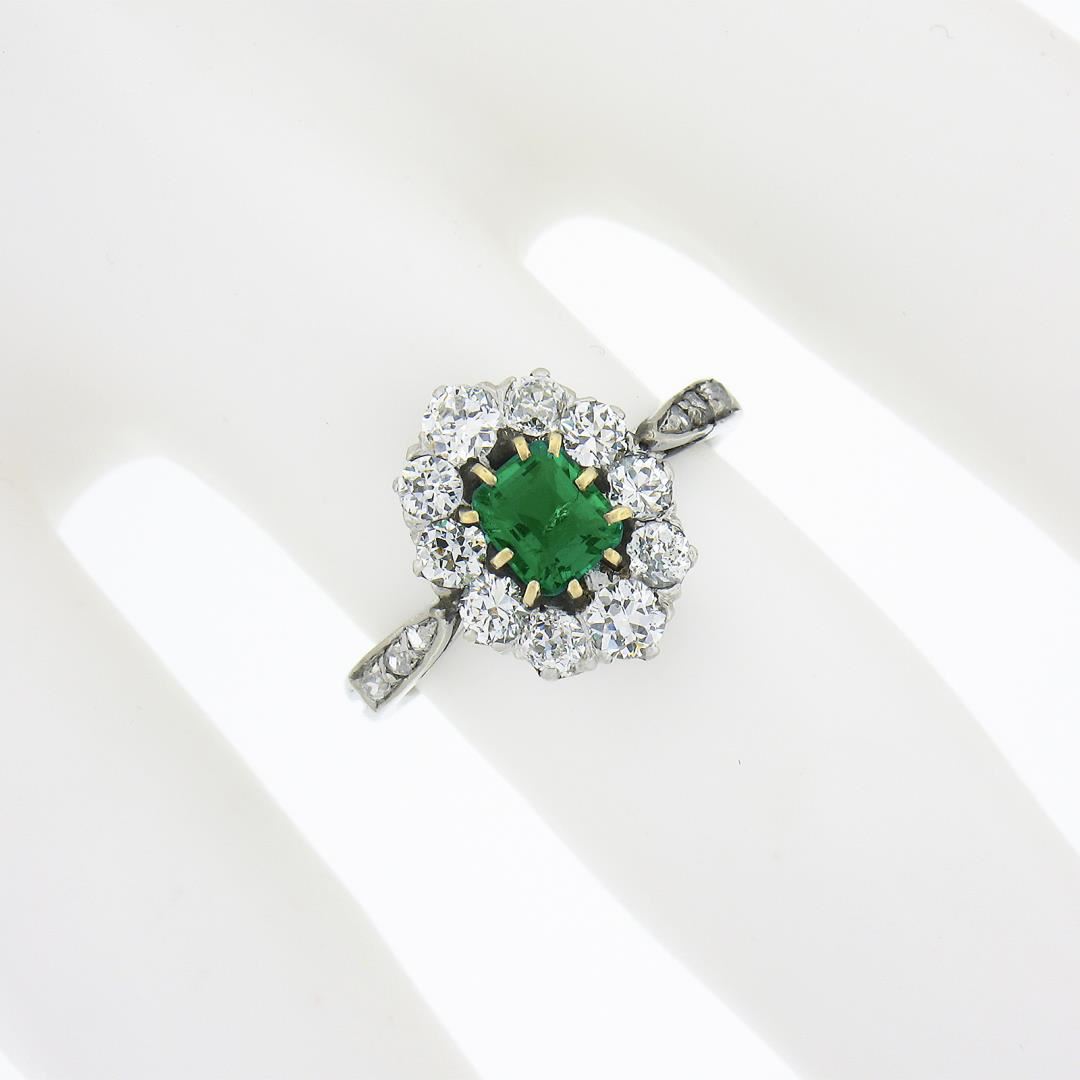 An antique solid platinum ring, with 1 emerald cut natural emerald (4.9x4.2mm), and a halo of 10 old European cut natural diamonds (G-I - VS1-VS2 w/ a few SI1 ; 0.60ctw), and 6 old rose cut natural diamonds (I - SI1 ; 0.06ctw).. The ring is size 4.5, weighs a total of 2.84 grams, and measures 12.2mm wide.