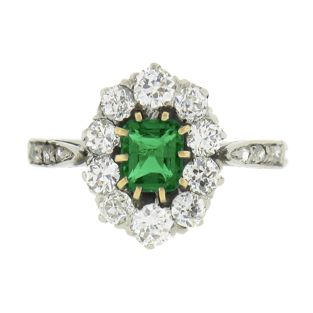 An antique solid platinum ring, with 1 emerald cut natural emerald (4.9x4.2mm), and a halo of 10 old European cut natural diamonds (G-I - VS1-VS2 w/ a few SI1 ; 0.60ctw), and 6 old rose cut natural diamonds (I - SI1 ; 0.06ctw).. The ring is size 4.5, weighs a total of 2.84 grams, and measures 12.2mm wide.