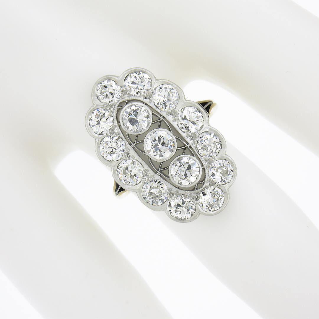 An antique solid platinum & yellow gold ring, with 15 old european cut natural diamonds (F-H - VS2-I1 ; 2.50ctw(). The ring is size 5.0, weighs a total of 4.09 grams, and measures 22.8mm wide.