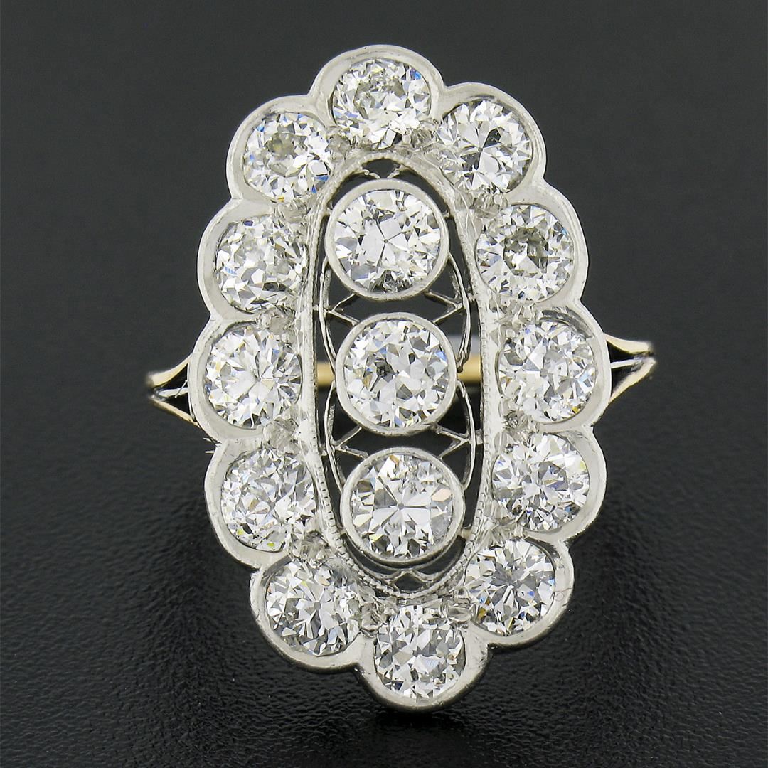 An antique solid platinum & yellow gold ring, with 15 old european cut natural diamonds (F-H - VS2-I1 ; 2.50ctw(). The ring is size 5.0, weighs a total of 4.09 grams, and measures 22.8mm wide.
